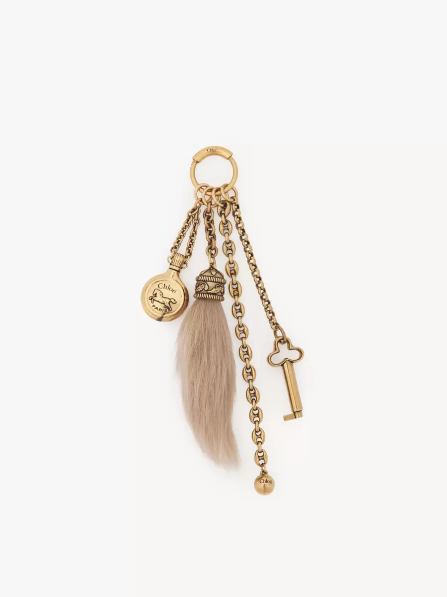 Altın pirinçten üretilen bu Chloé Symbols çanta süsü, farklı uzunluklarda koyun postu süslemeli birden fazla zincir, bir anahtar, minyatür küre kolye uçları ve Maison’s At Madalyası’nı bir araya getiriyor.