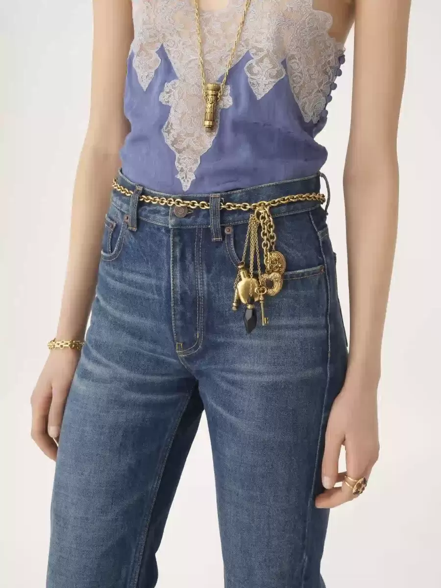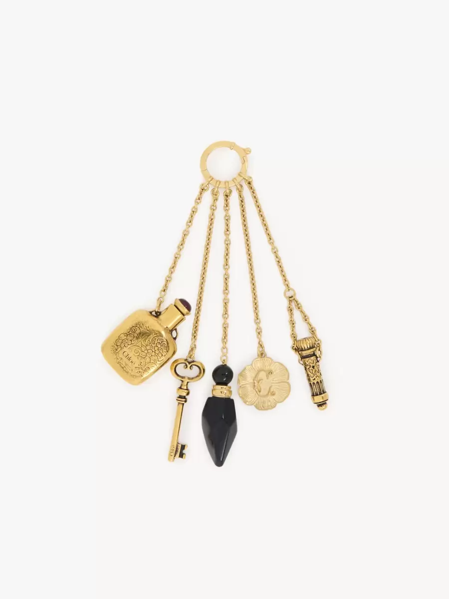 Eski altın pirinç ve reçineden yapılmış Château Treasures tılsımı, sallanan zincirlere oturtulmuş beş kolye ucu içerir: üç farklı şişe, bir anahtar ve çiçekli bir “C” harfi. Çeşitli tılsımları simgeleyen bir Chloé logosu gravürü.