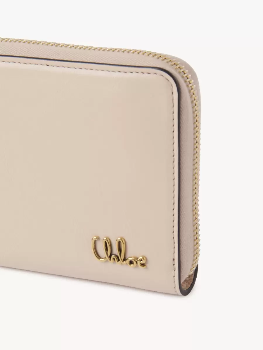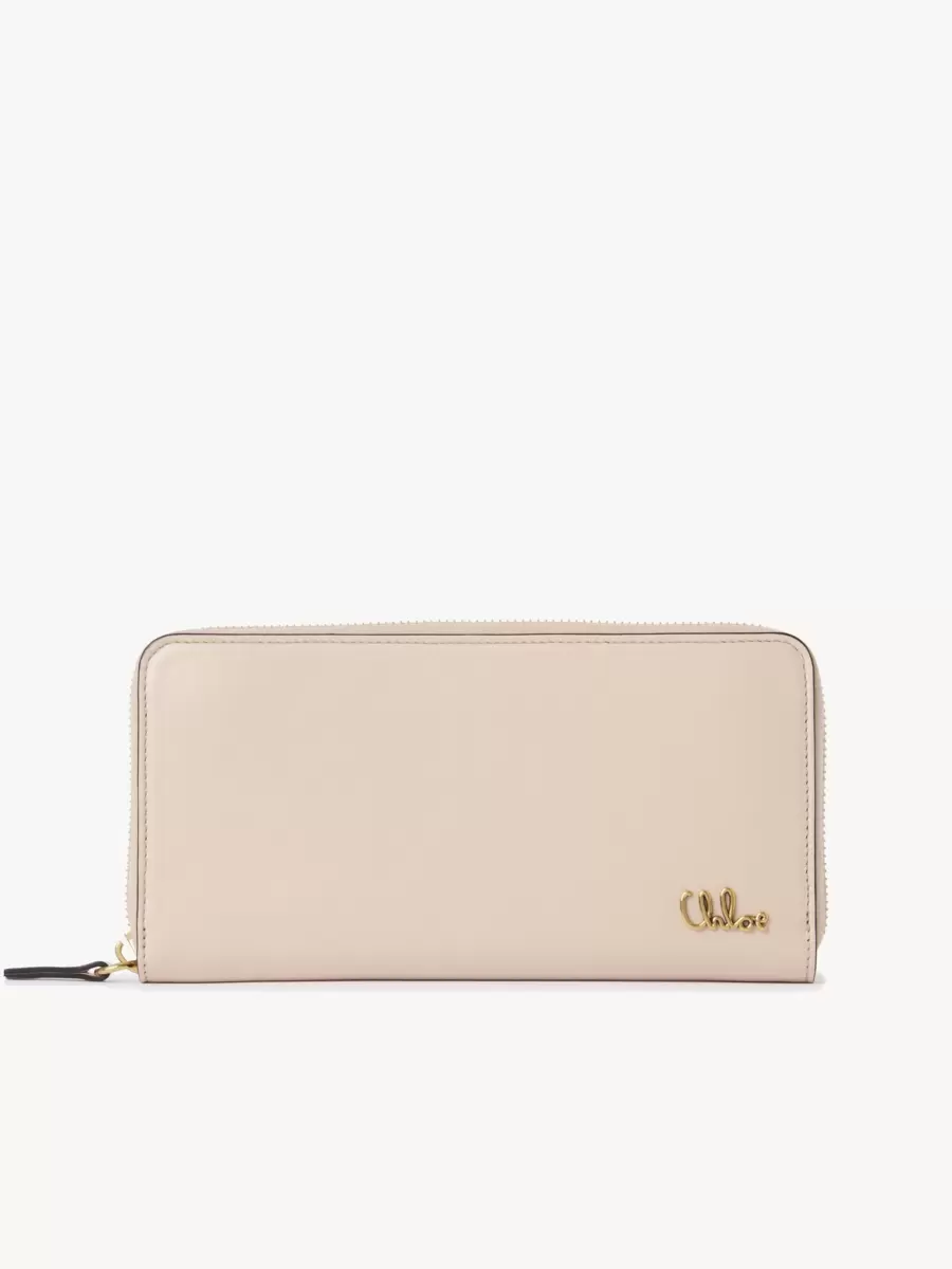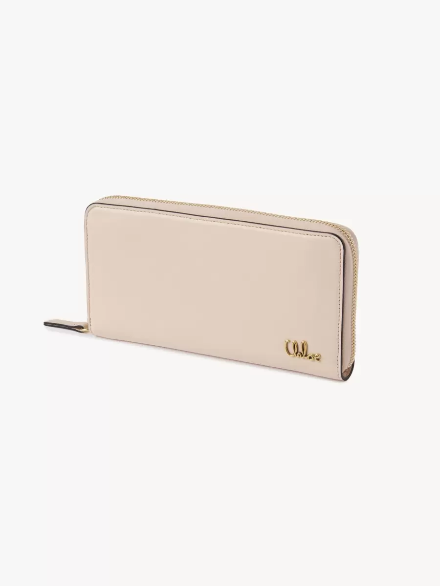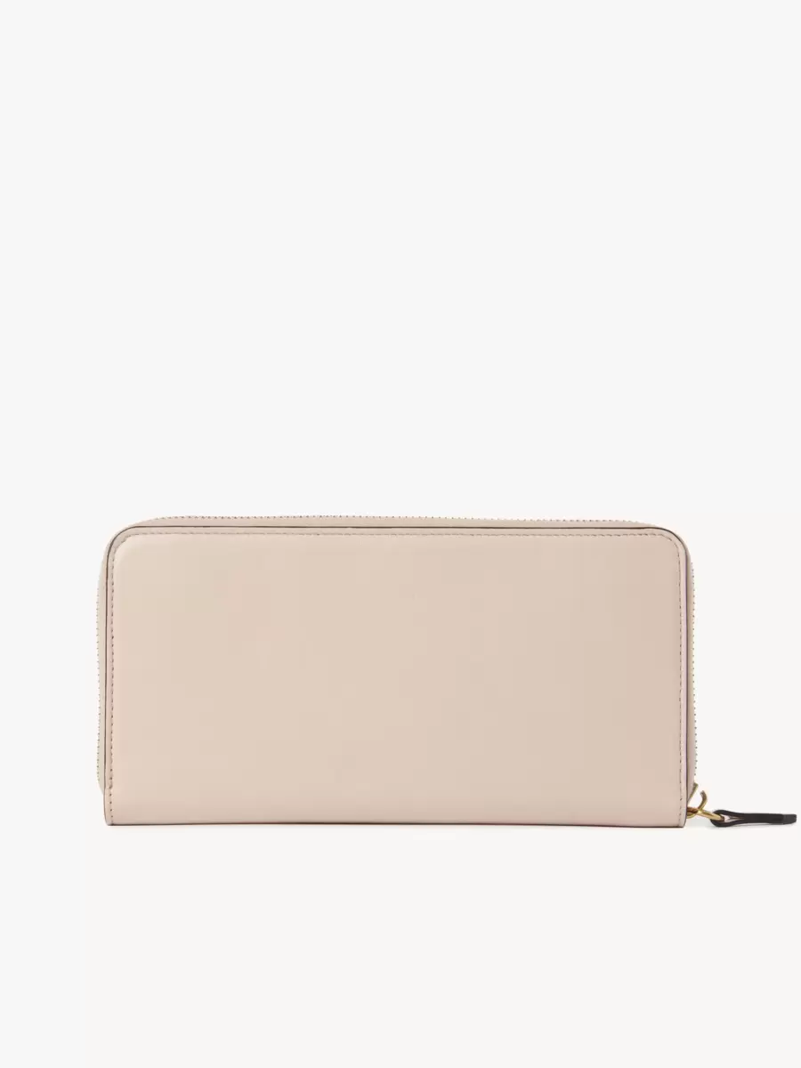 Parlak dana derisinden üretilen Chloé Iconic fermuarlı uzun cüzdan, minimalist tasarımı Maison arşivlerinden metalik bir imzayla birleştiriyor.