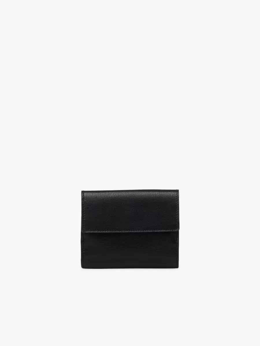 Tenli keçi derisinden üretilen küçük Zarf üç katlı, bir banknot bölmesi, bir bozuk para cebi ve altı kart yuvasına sahiptir.