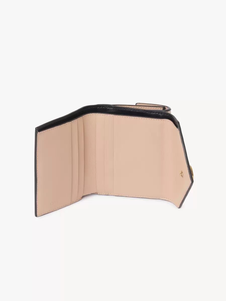 Tenli keçi derisinden üretilen küçük Zarf üç katlı, bir banknot bölmesi, bir bozuk para cebi ve altı kart yuvasına sahiptir.