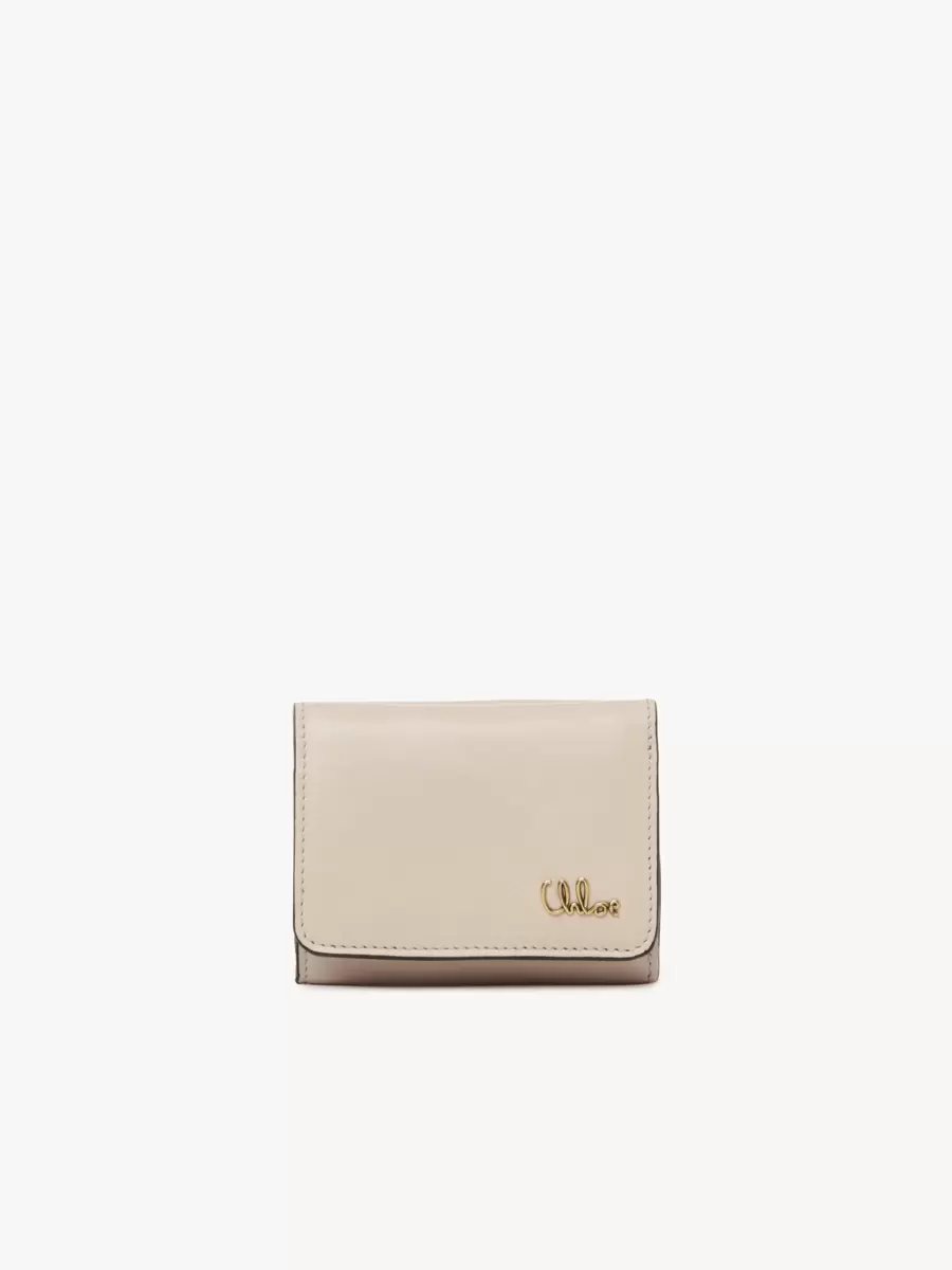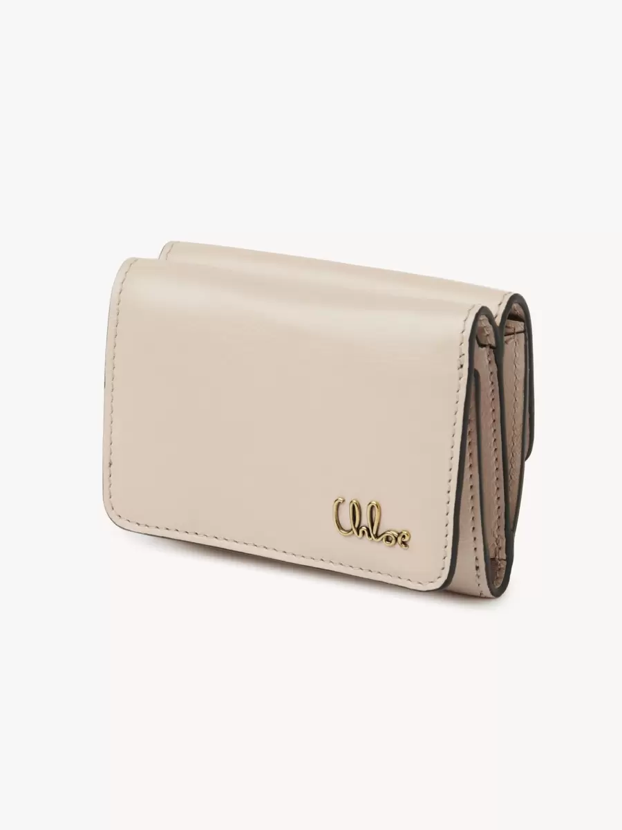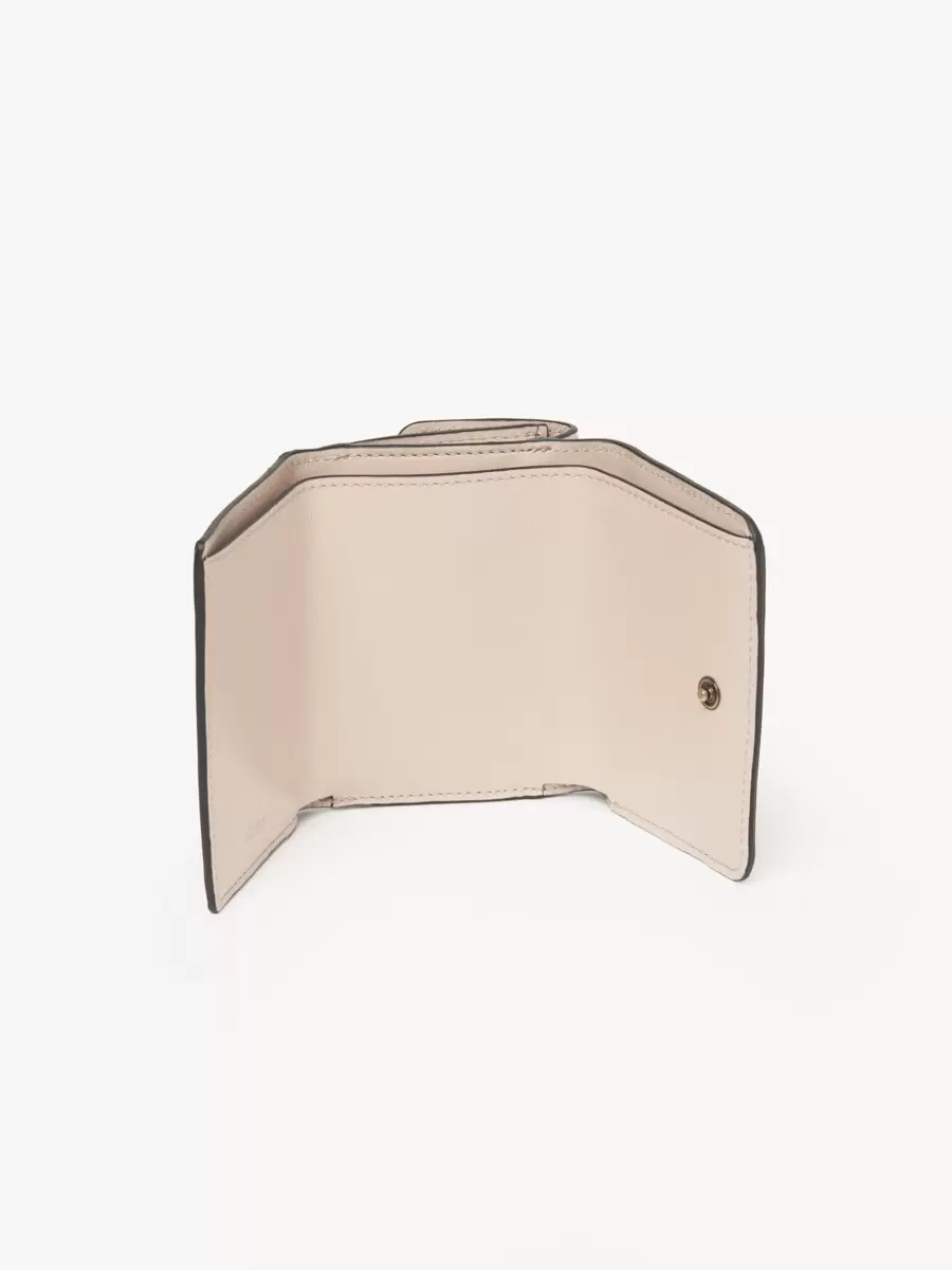 Parlak dana derisinden üretilen mini Chloé Iconic üç katlı cüzdan, minimalist bir tasarımı Maison arşivlerinden metalik bir imzayla birleştiriyor.