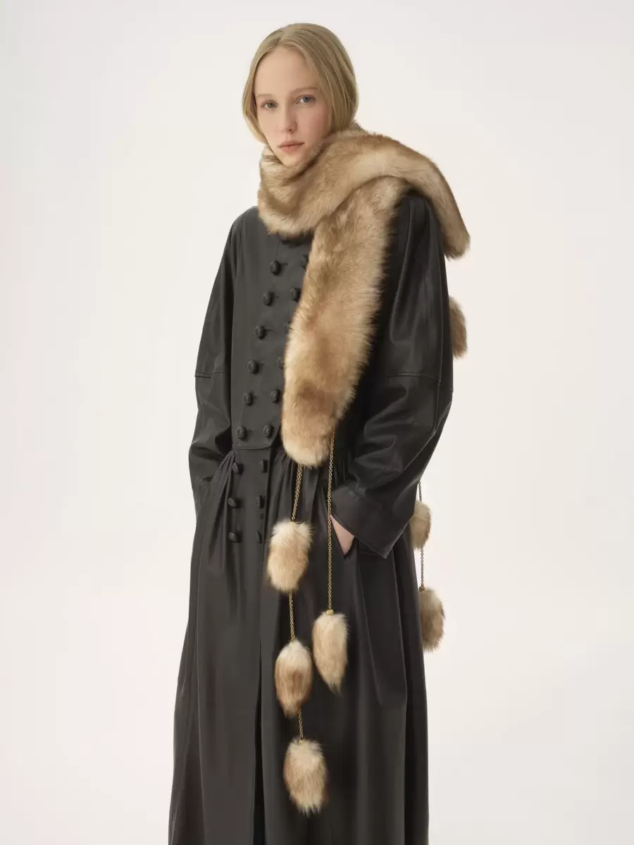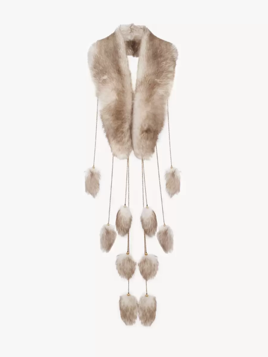 Treasure Tails koyun postu atkı, büyük bir yaka atkısını, altın pirinçten sarkan zincirlere yerleştirilmiş on ponponla birleştirerek mücevher efekti yaratıyor.