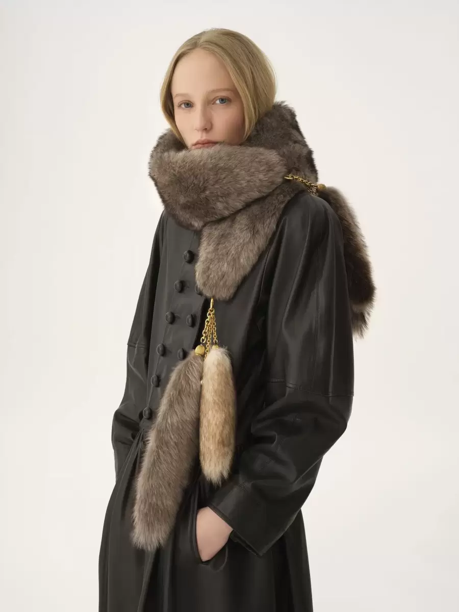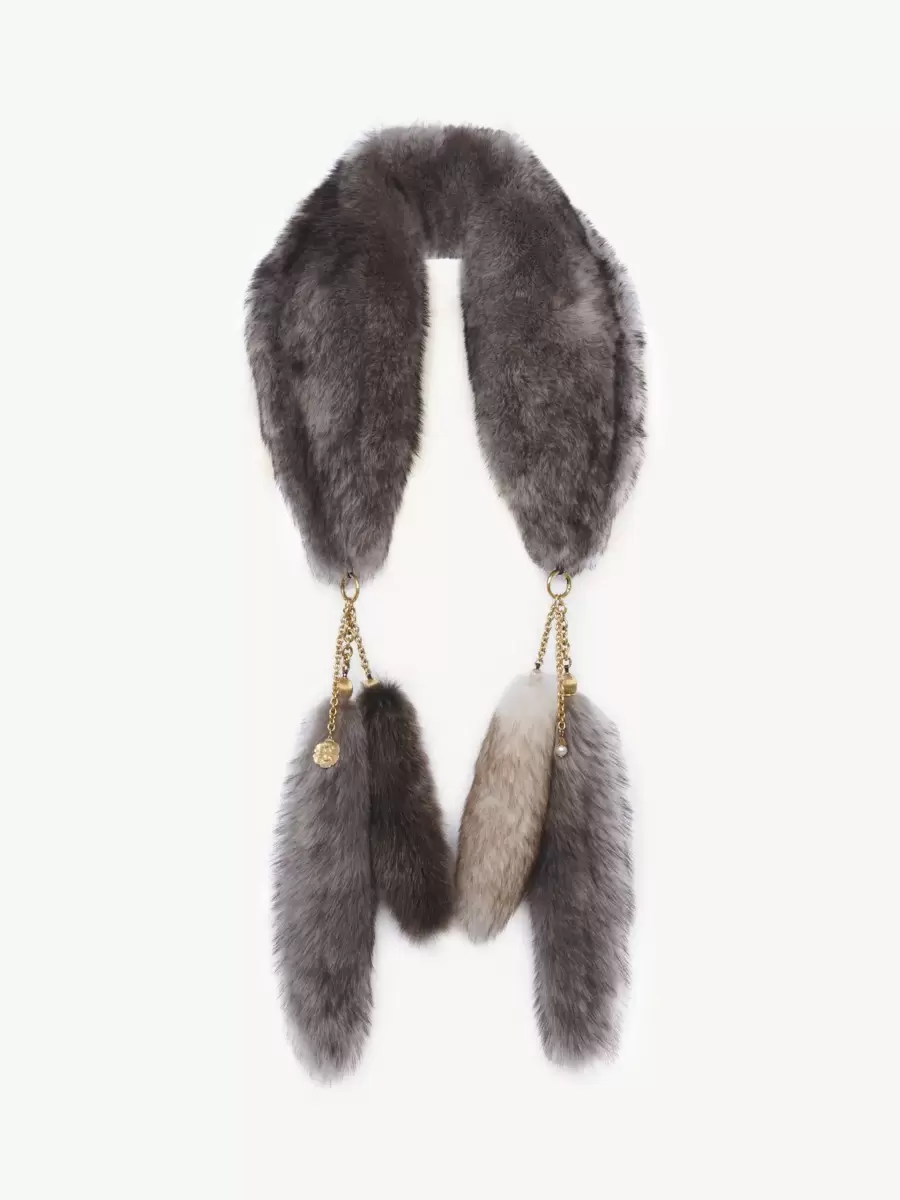 Treasure Tails koyun postu atkı, yaka atkısını, sarkan altın pirinç zincirlere geçirilmiş iki küçük ve iki orta boy kuyrukla birleştirerek mücevher efekti yaratıyor. Chloé işlemeli çiçekli “C” tılsımı ve reçine inci bu parçayı tamamlıyor.