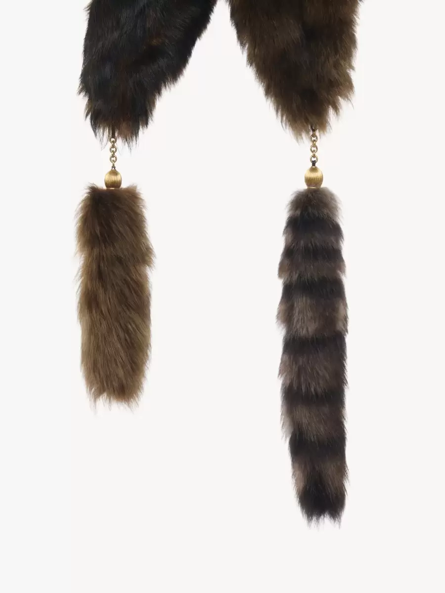 Treasure Tails koyun postu atkı, yaka atkısını iki asimetrik kuyrukla (biri çift renkli, diğeri düz) birleştiriyor. Kuyruklar, mücevher efekti için sarkan altın pirinç zincirlere takılmış ve kancalı bağlantı, atkıyı yakadan kapatmanızı sağlıyor.
