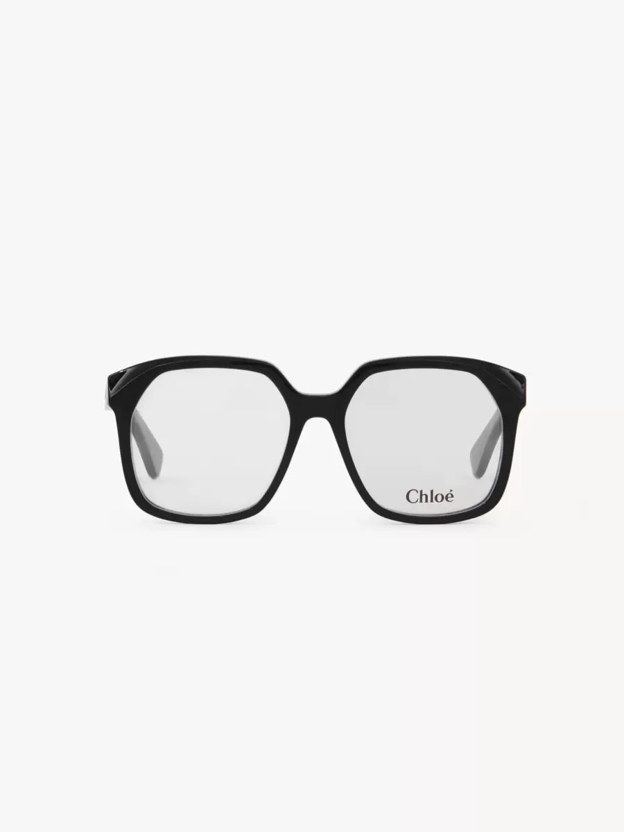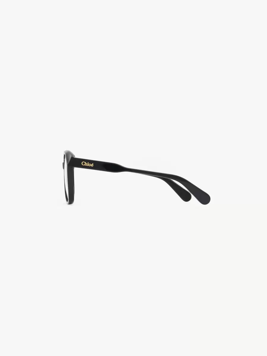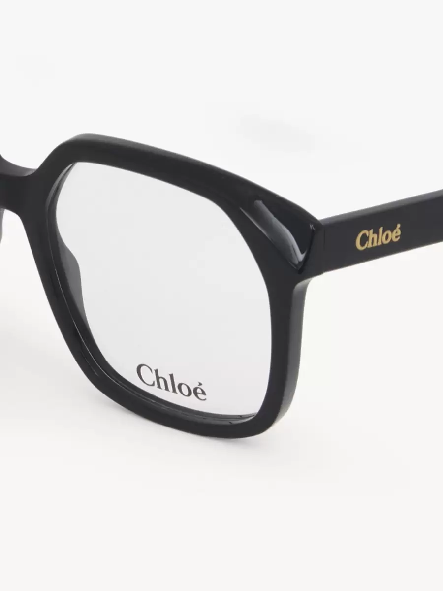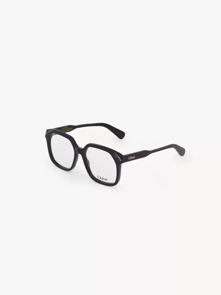 Geri dönüştürülmüş asetattan üretilen bu Gayia kare gözlük, eğimli kenarlarında taraklı detaylar bulunan hafif, parlak siyah bir çerçeveye sahiptir. Her iki sapında da Chloé logosu yer almaktadır.