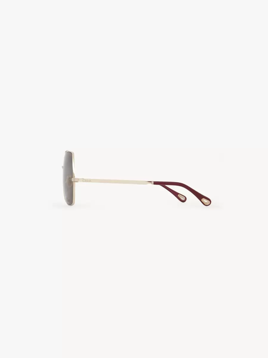 Bu Aly güneş gözlükleri, klasik pilot stiline modern bir dokunuş katıyor. Parlak altın tonlarında metalden kare çerçeveler, kahverengi, gri ve haki renk paletinde üçlü degrade camlarla tamamlanıyor. Chloé logosu sol camı tamamlıyor.