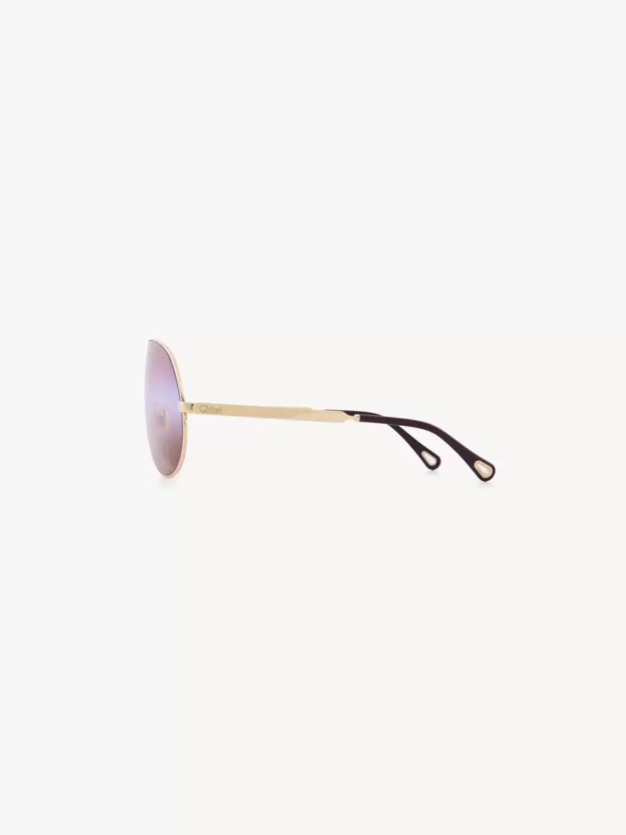 Klasik pilot şeklini yeniden yorumlayan bu Aly maskeli güneş gözlüğü, hafif parlak altın metal çerçeveyi kırmızı, pembe ve kahverengi paletindeki üçlü degrade camlarla birleştiriyor. Chloé logosu sol camı tamamlıyor.