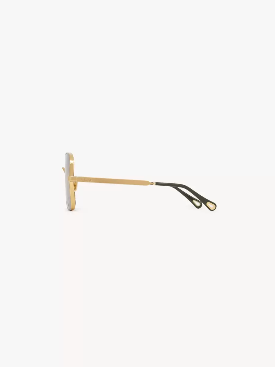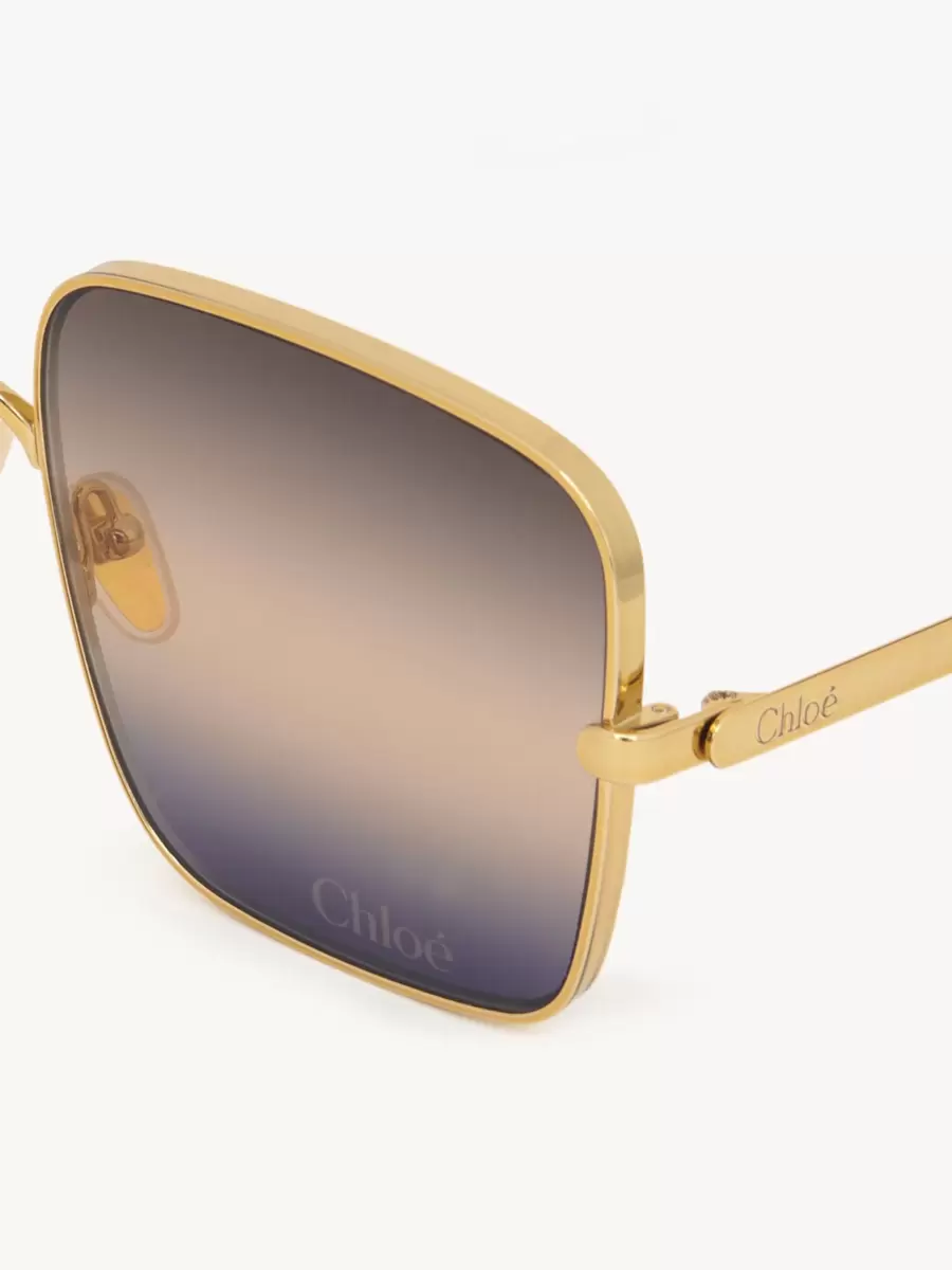 Bu Aly kare güneş gözlüğü, parlak altın tonlarında metalden yapılmış kalın grafik çerçeveyi bejden maviye geçişli camlarla birleştiriyor. Chloé logosu sol camı tamamlıyor.