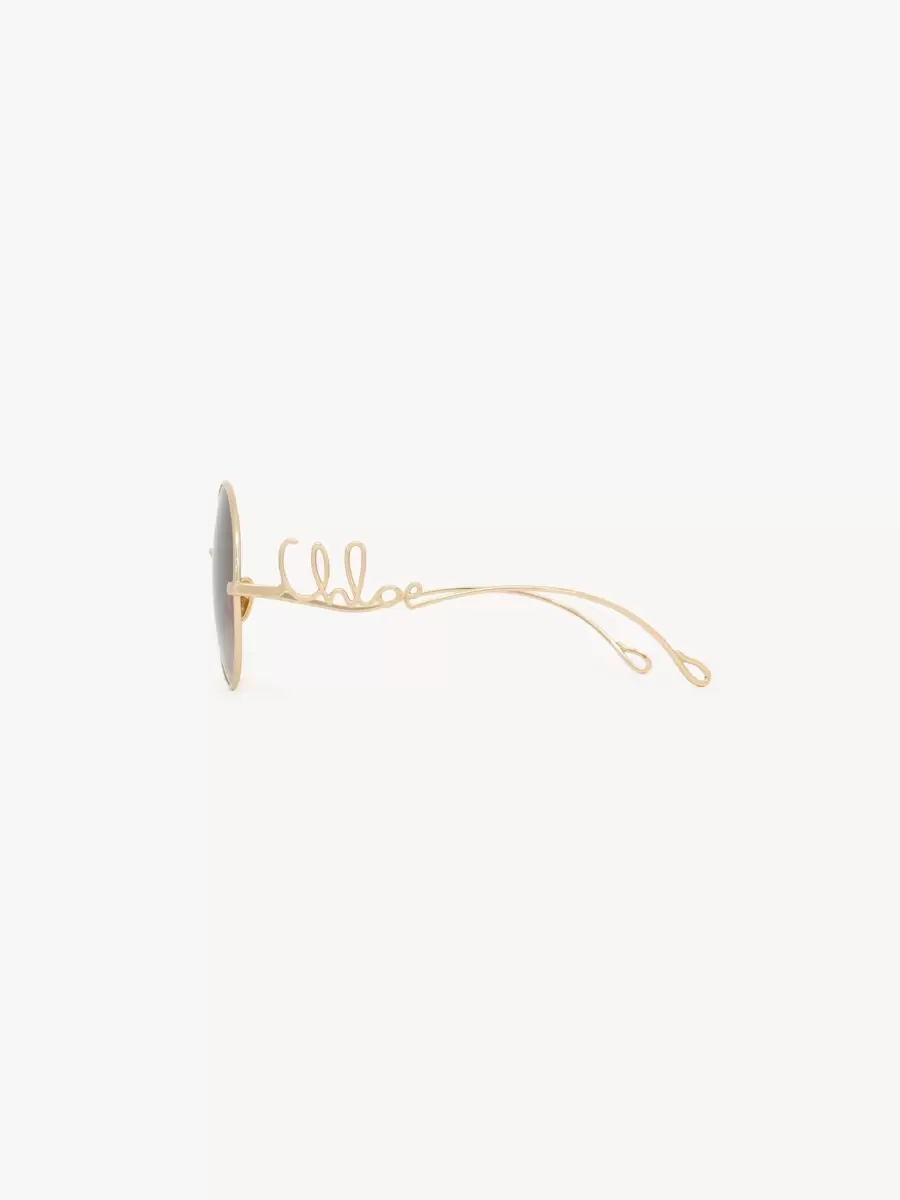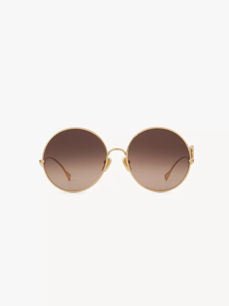 Maison’un mirasından ilham alan bu Chloé Iconic yuvarlak güneş gözlüğü, parlak açık altın metalden yapılmış hafif bir çerçeveyi büyük boy degrade kahverengi camlarla birleştiriyor. Sol sap, Chloé Iconic logosuyla imzalanmış.