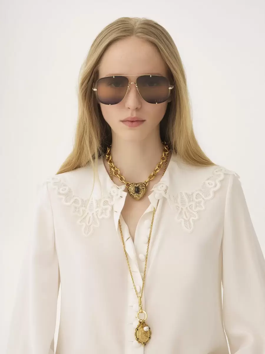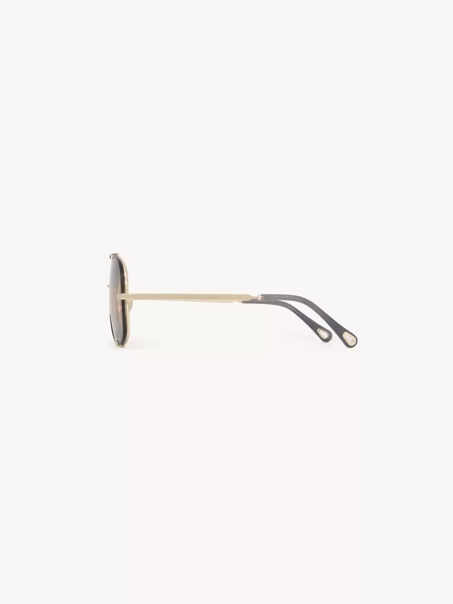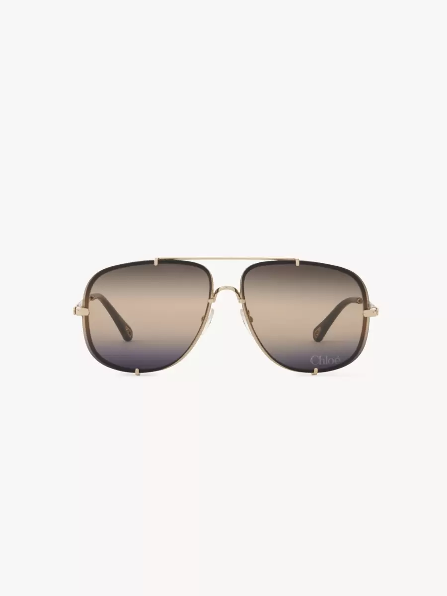 Bu Ivy pilot güneş gözlüğü, parlak açık altın metalden hafif bir çerçeve ve metal kancalarla sabitlenmiş üçlü degrade bejden maviye camlarla birleşiyor. Sol cam ve saplarda Chloé logosu gravürü yer alıyor.