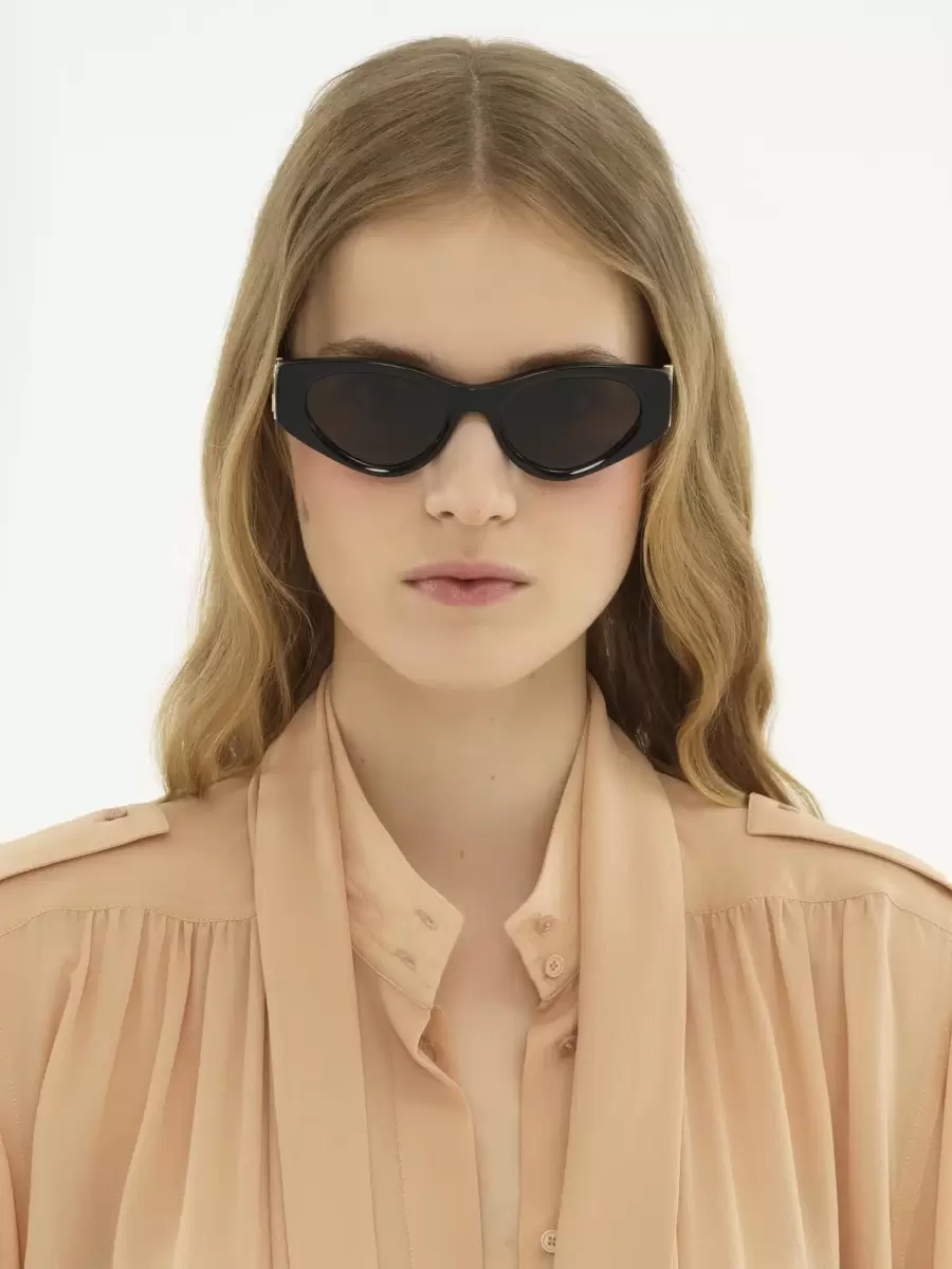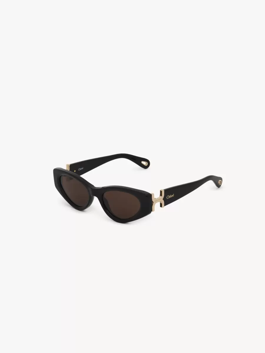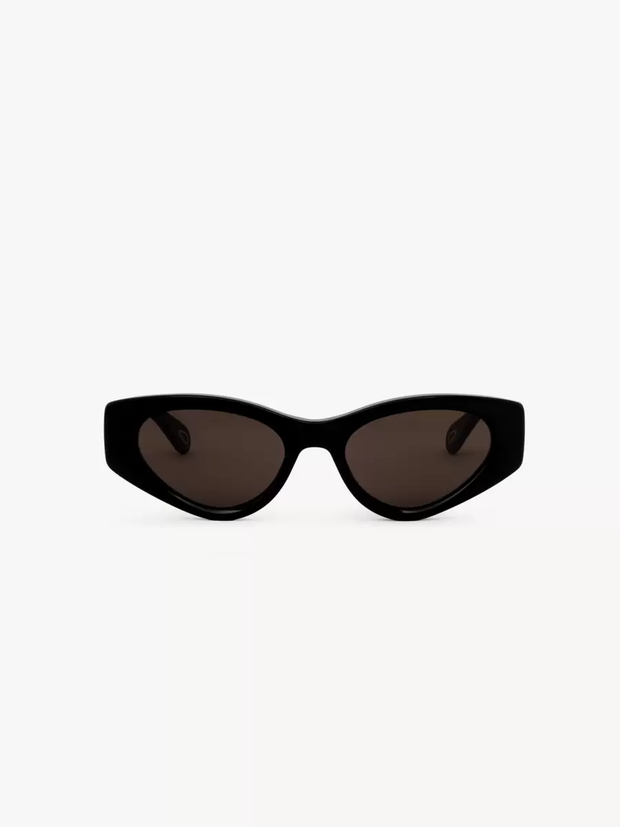 Düşük darbeye dayanıklı asetattan üretilen parlak siyah çerçeve, biyolojik bazlı naylondan yapılmış düz kahverengi camlarla birleştirilmiştir. Chloé logosu sol şakaktaki detayları vurgularken, şakak uçlarındaki damla şeklindeki açıklıklar bu kadın güneş gözlüklerini Chloé’nin gözlük takılarıyla uyumlu hale getirir.