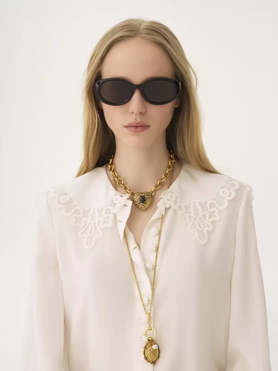 Şakak uçlarındaki damla şeklindeki açıklıklar, bu güneş gözlüklerini Chloé’nin gözlük takılarıyla uyumlu hale getiriyor.