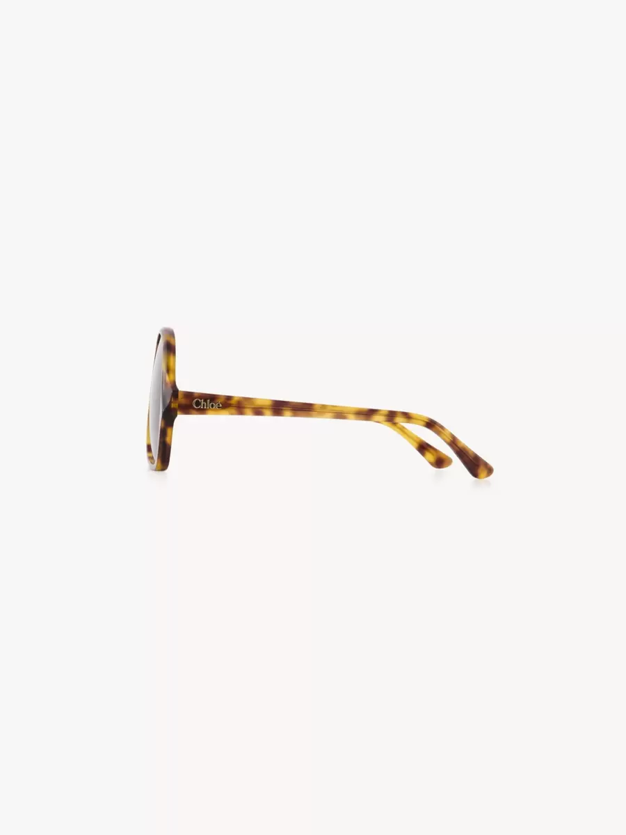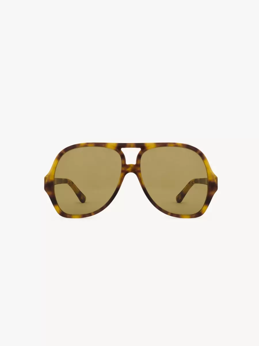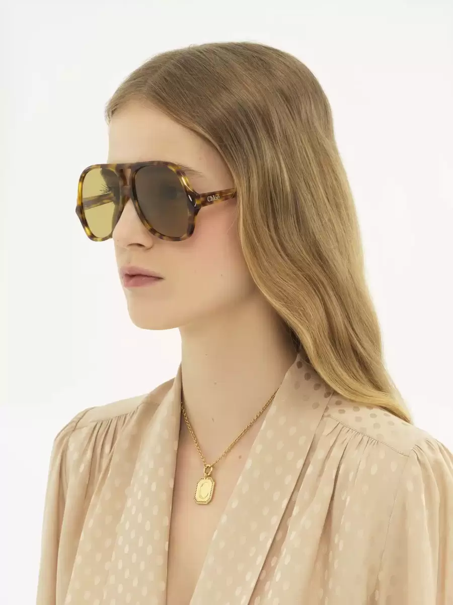 Salomé pilot güneş gözlükleri, Chloé logosuyla imzalanmış alçak saplara ve taraklı detaylara sahip, düşük etkili asetattan yapılmış parlak Havana çerçeveye sahiptir. Bu 70’ler tarzı güneş gözlüklerini sağlam haki camlar tamamlar.