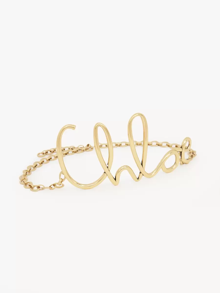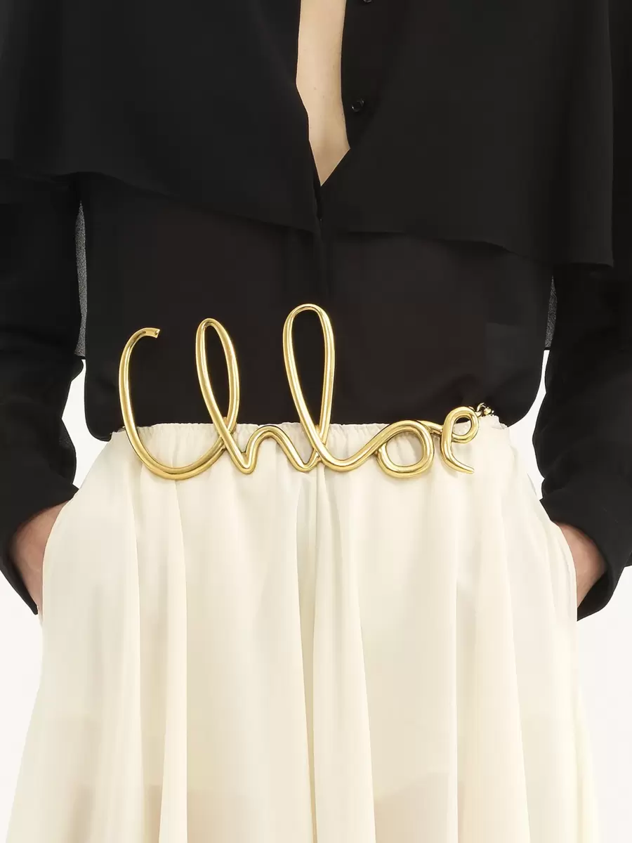 Chloé’nin ikonik büyük zincir kemeri, markanın mirasına dayanan bir tasarımdan ilham alıyor. Modern yorum, altın pirinçten yapılmış bir Chloé logosuyla zinciri birleştiriyor. Chloé’nin mücevher serisine bağlı olan kemer, belde yüksekte veya kalçada düşükte takılabilir.
