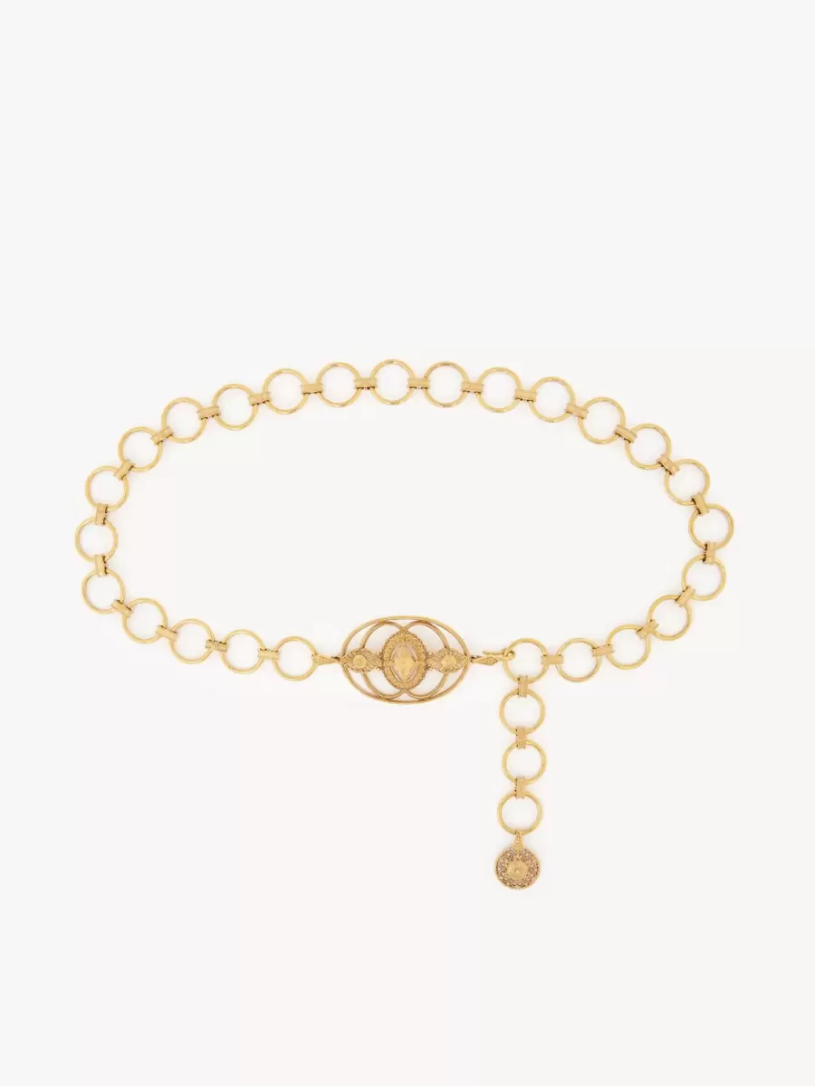 Yuvarlak halkalar ve özenle kesilmiş süs tokası bulunan vintage altın pirinçten yapılmış Chloé Muska takı kemeri. Bacak boyunca uyumlu bir kolye ucu sallanıyor. Chloé logosu gravürüyle imzalanan ayarlanabilir zincir, kancalı bir kapamaya sahip.