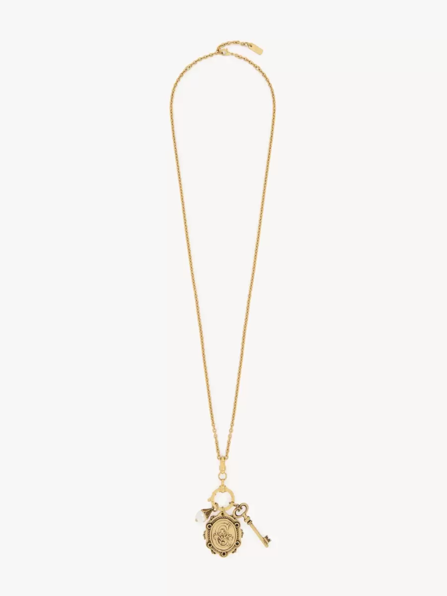 Eski altın pirinçten yapılmış Château Treasures kolye ucu, ortadaki halkada üç tılsım barındırıyor: siyah cam çivilerle işlenmiş süslü bir “C” madalyonu, bir anahtar ve bir inci. Chloé logosu çeşitli tılsımlara işlenmişken, altın tonlu bir Chloé logo plakası zinciri simgeliyor.