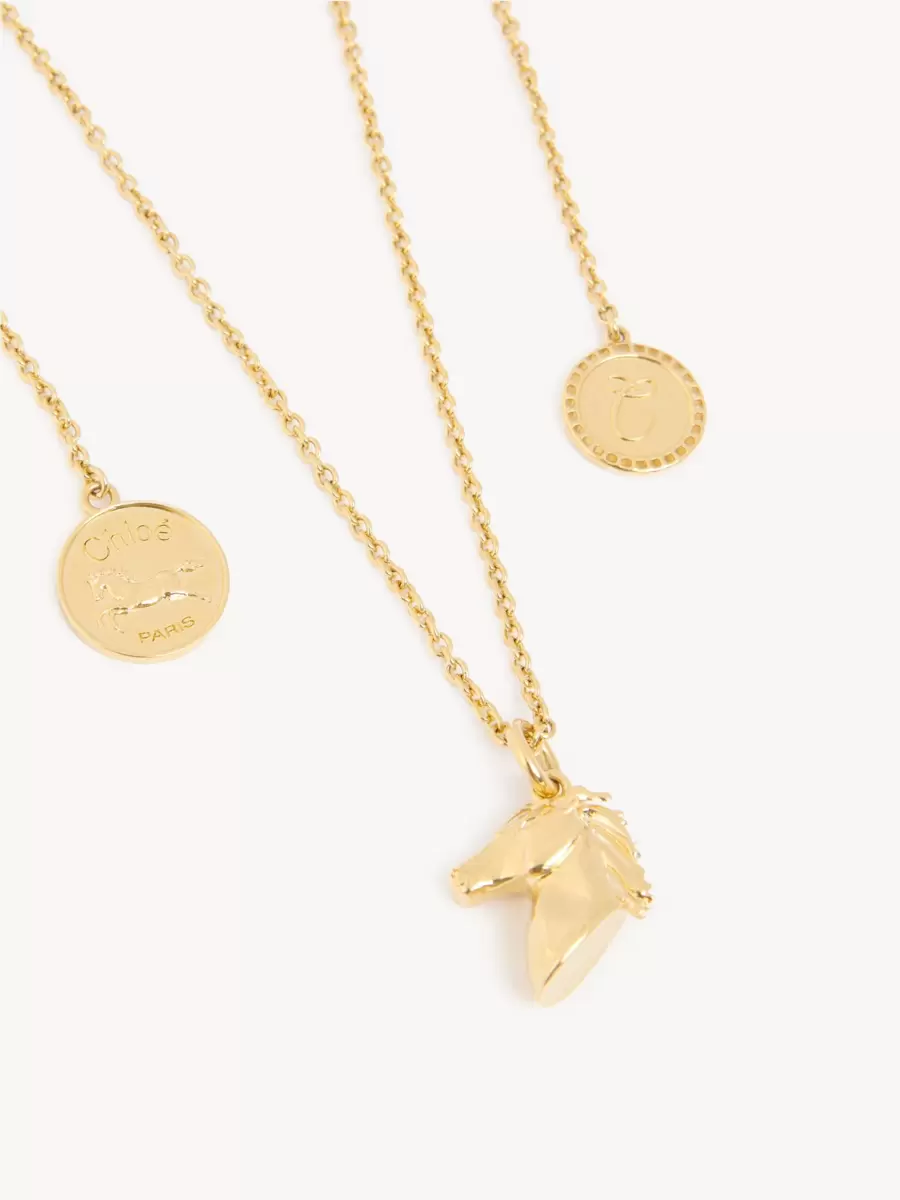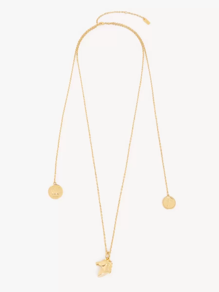Vintage altın pirinçten Chloé Charms kolye. Ayarlanabilir çift zincir, Maison’un DNA’sına dayanan üç kolye ucuyla detaylandırılmıştır: bir at başı ve biri dantel efektli bir süslemeyle şekillendirilmiş, diğeri Chloé Paris logosuyla imzalanmış iki madalyon. Bu parça bir Chloé logo etiketiyle işaretlenmiştir.