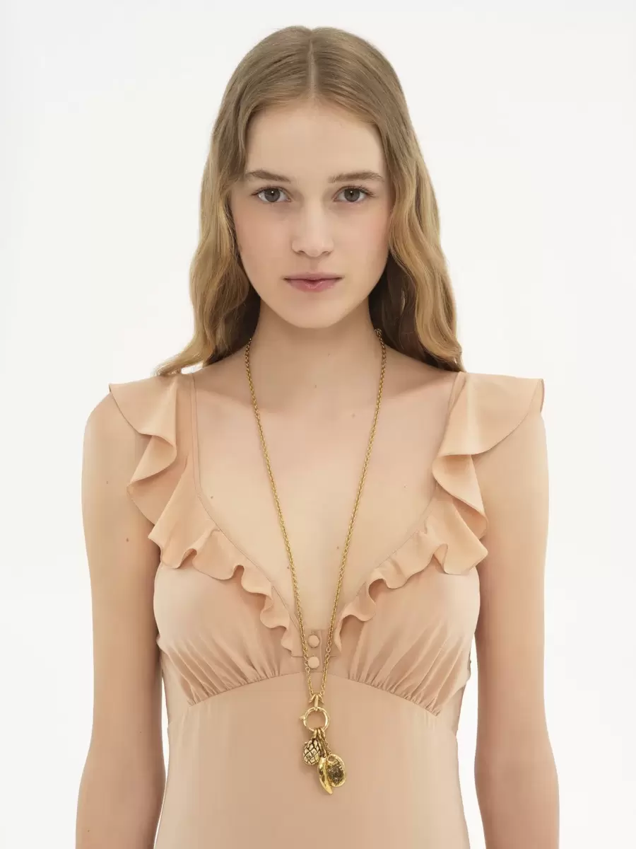 Vintage altın pirinçten Chloé Charms kolye ucu. Zincir tek veya çift kat olarak takılabilirken, yüzük Maison’un mirasından ilham alan üç kolye ucuyla tamamlanıyor: bir ananas, bir muz ve bir taç yaprağı. Bu parça bir Chloé logo etiketiyle işaretleniyor.