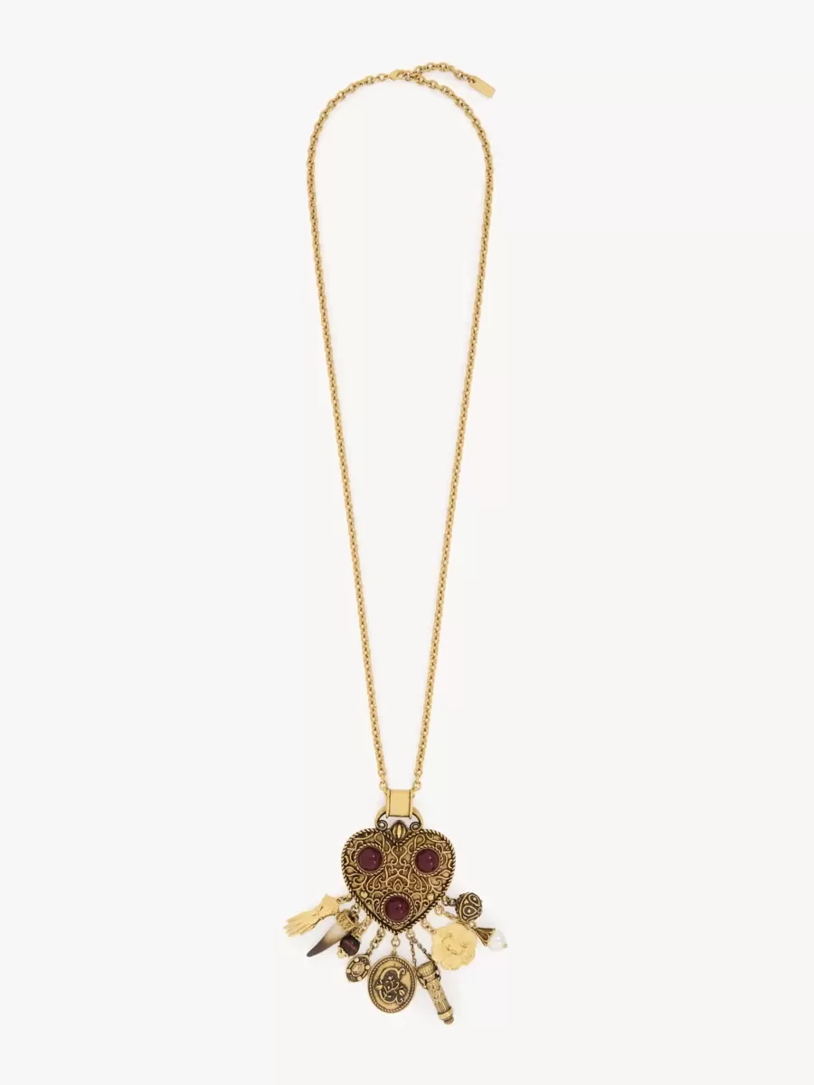 Vintage altın pirinçten yapılmış Chloé Heartfull kolye ucu, bordo reçine kakma ile süslenmiş büyük, süslü bir kalp kolye ucuna sahiptir. Kalpten çeşitli doku ve malzemelerden yapılmış vintage hazineleri tasvir eden çok sayıda tılsım sallanmaktadır.