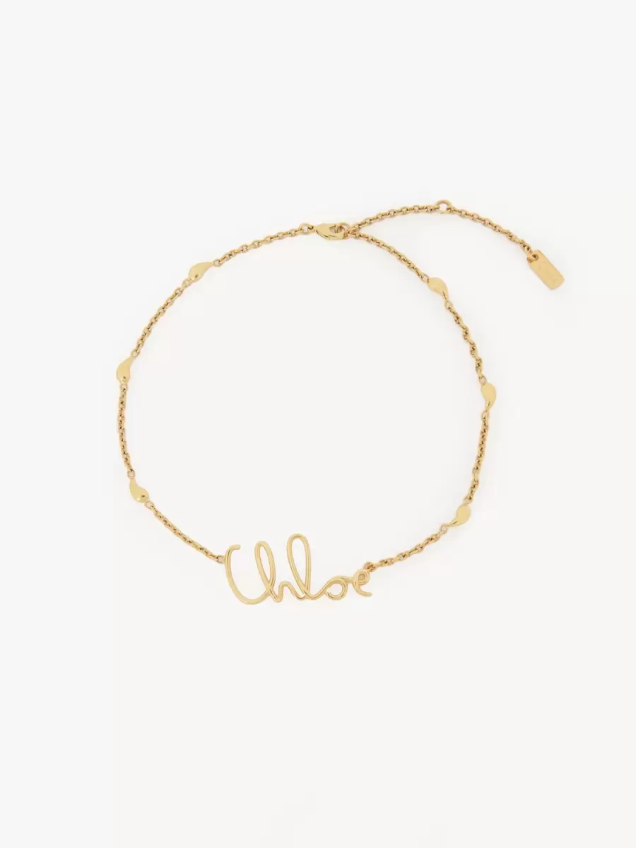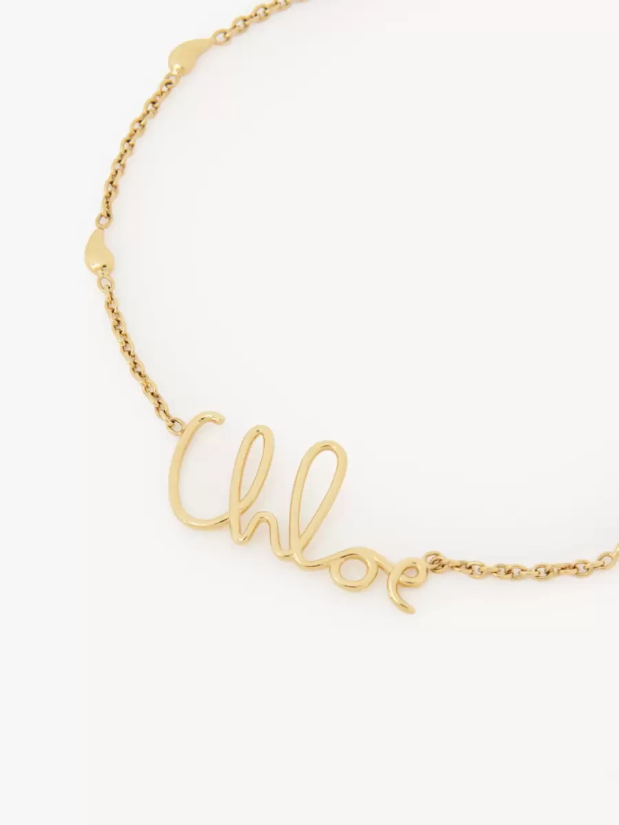 Klasik bir zincir kemerden ilham alan, vintage altın pirinçten yapılmış ikonik Chloé kolye. Chloé logosu yumuşak, el yazısı bir fontla vurgulanırken, zincirin etrafındaki vurgulu süslemeler Chloé’deki “é” harfine gönderme yapıyor.