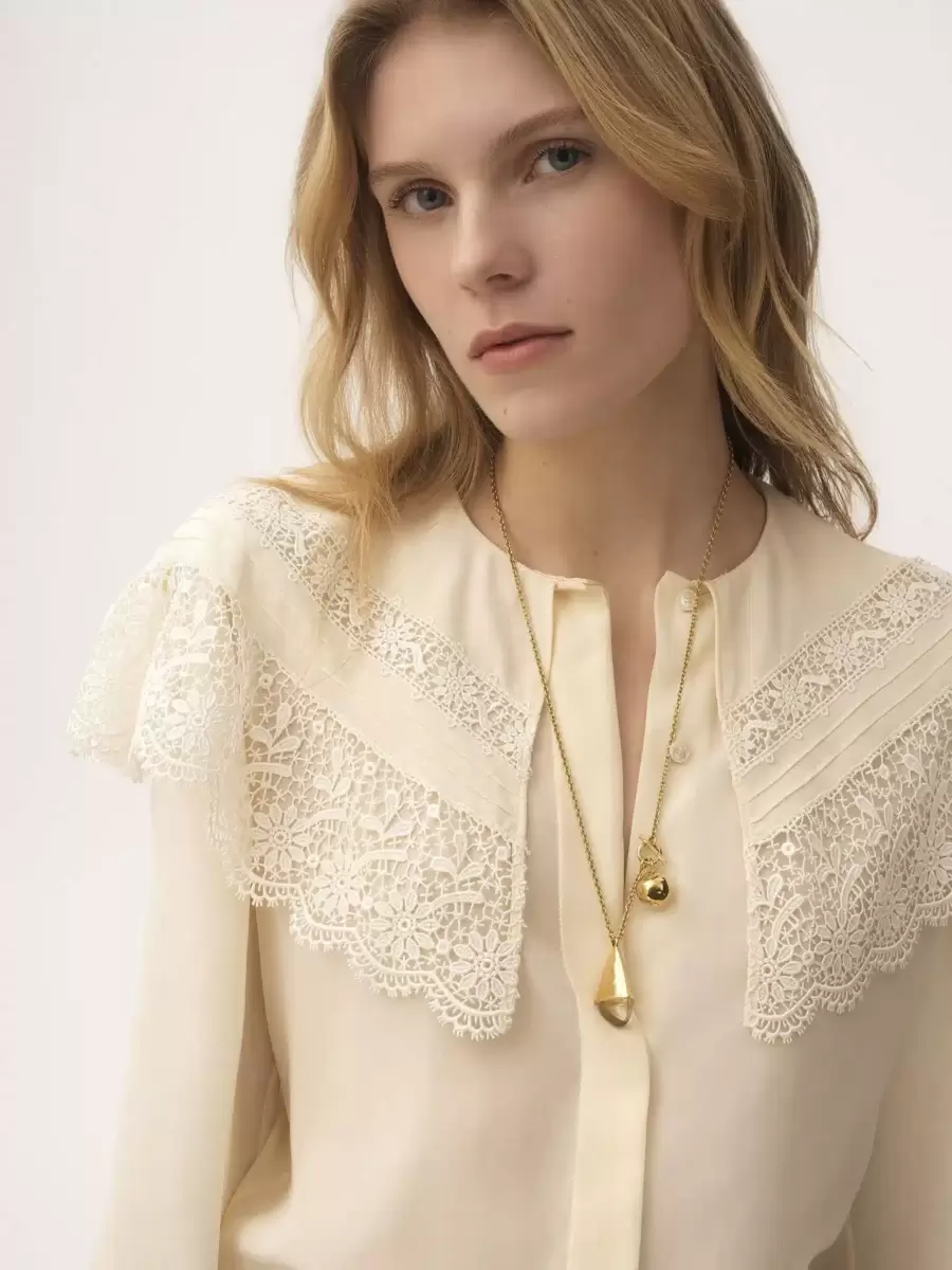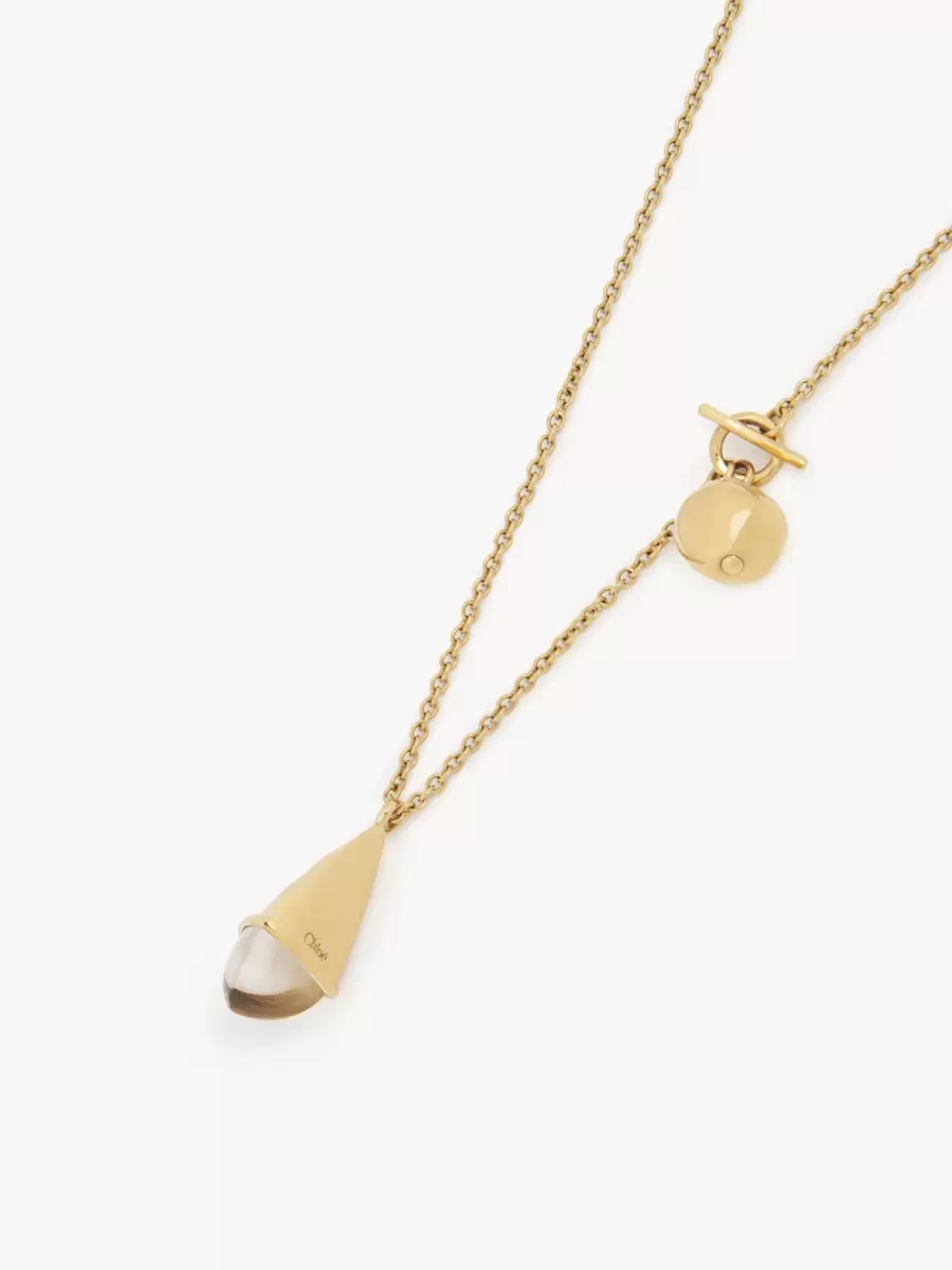 Chloé Prism kolye ucu, ince altın pirinç zinciri, şeffaf reçine detaylı, çift malzemeli, fasetli merkezi bir kolye ucuyla birleştiriyor. Zincirin bir tarafında altın pirinç küresel kolye ucu ve T-bar bağlantı detayı bulunurken, Chloé logosu gravürü ve plaka bu parçayı tamamlıyor.