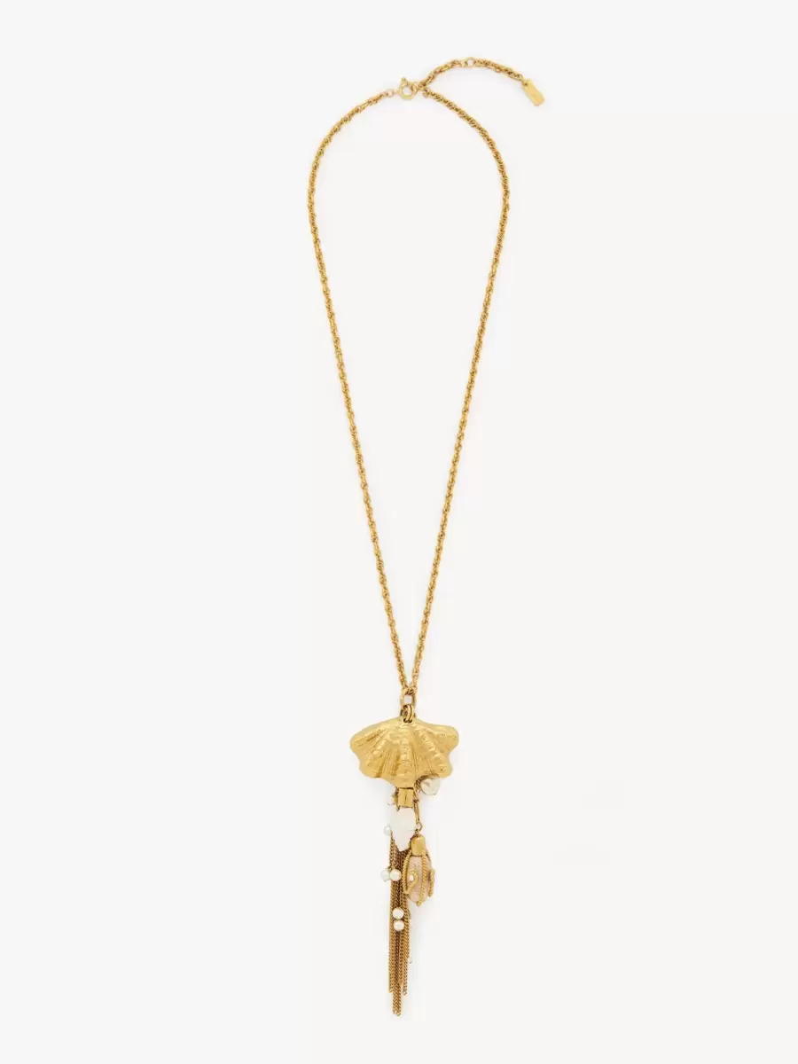 Gerçek deniz kabukları da dahil olmak üzere çeşitli dokulara sahip, vintage altın pirinçten yapılmış Chloé Shells kolye ucu. Uzun ve ayarlanabilir zincir, büyük bir deniz kabuğu kolye ucu ve iki küçük deniz kabuğu, sallanan zincirler ve sentetik incilerle süslenmiştir. Bir Chloé logo plakası bu parçayı tamamlar.
