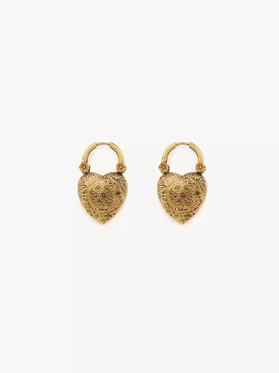 Chloé logosu gravürüyle imzalanmış küçük süs kalp kolye uçlarına sahip, vintage altın pirinçten yapılmış Château Treasures küpeler.