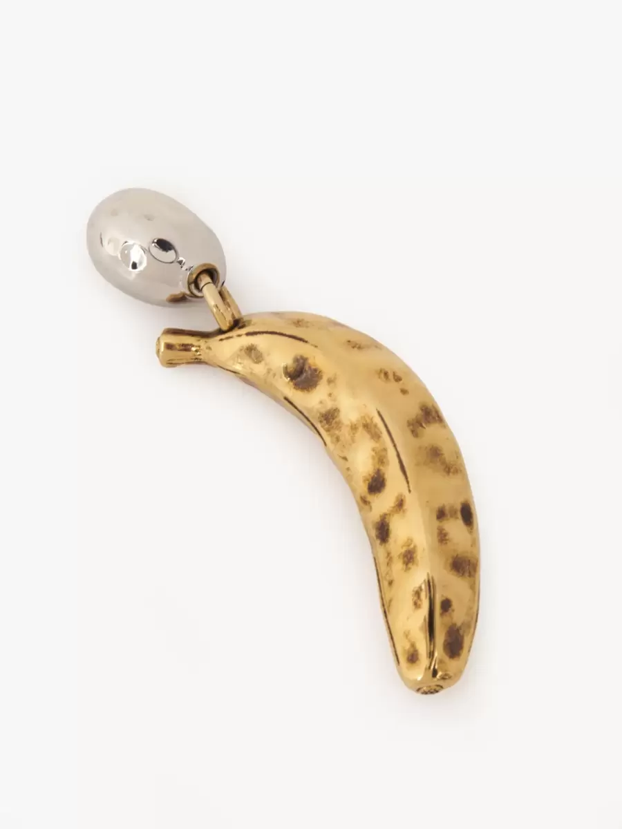 Maison’un 2001 İlkbahar koleksiyonundan ilham alan, gümüş tonlarında detaylara sahip, vintage altın pirinçten yapılmış Chloé Bananas küpeler. Küpeler, Chloé logosu gravürüyle tamamlanan özgün muz şekli ve rengine sahiptir.