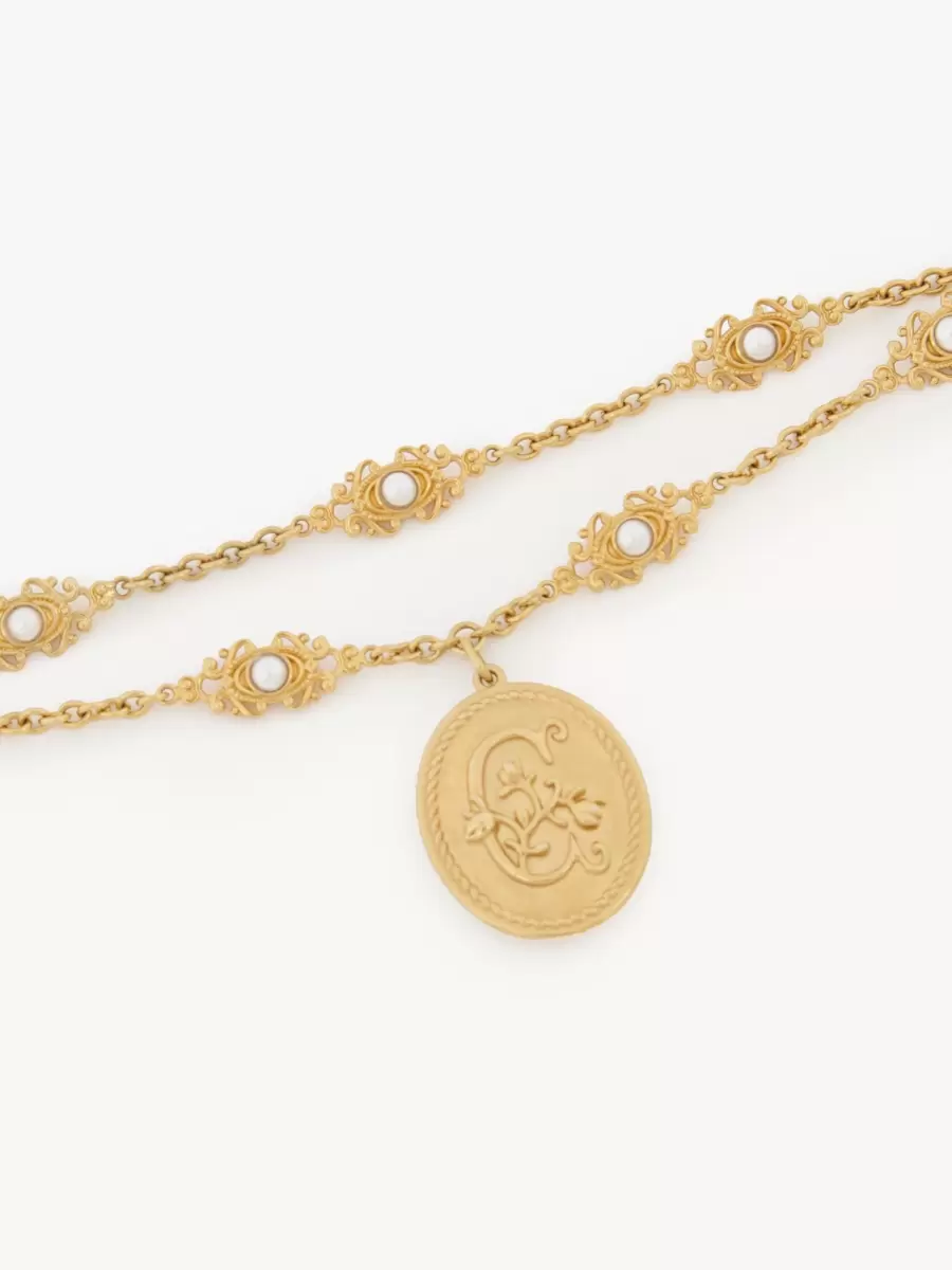 Çift taraflı, çiçekli “C” madalyonlu merkez parçasına sahip, vintage altın pirinçten yapılmış Château Treasures çift zincirli bileklik. Reçine inciler süs zincirini süslüyor. Altın tonlu bir Chloé logo plakası bu parçayı simgeliyor.