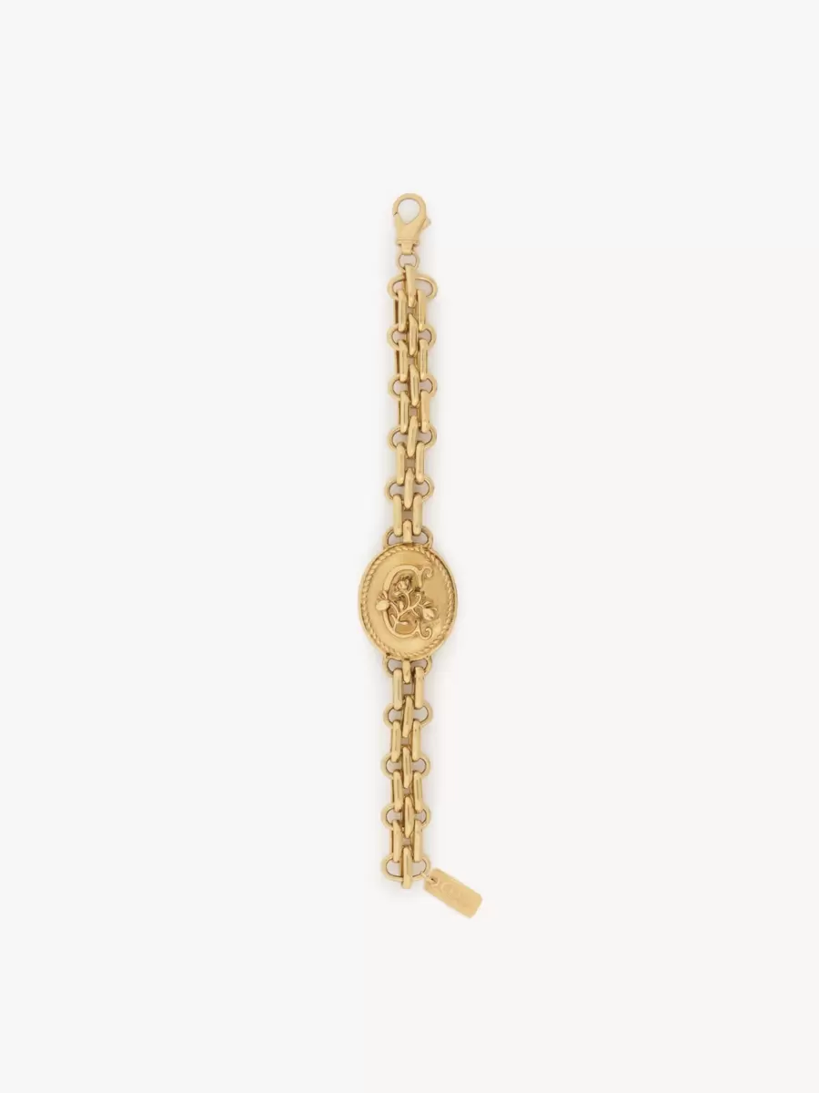 Çift taraflı, çiçekli “C” madalyon orta parçasıyla süslenmiş, vintage altın pirinçten yapılmış Château Treasures tank bileziği. Altın tonlu bir Chloé logo plakası bu parçayı simgeliyor.