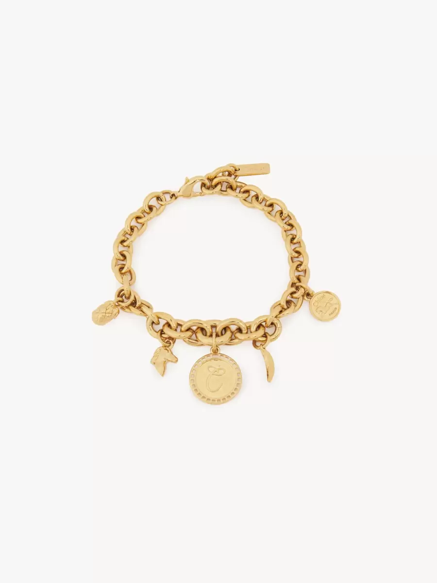 Chloé Charms bileklik, ananaslardan atlara kadar markanın DNA’sına dayanan çok sayıda tılsım ve dantel efektli bir süslemeyle şekillendirilmiş bir “C” madalyonuyla birlikte vintage altın pirinçten üretilmiştir. Bu parça, Chloé logo etiketiyle tamamlanmıştır.