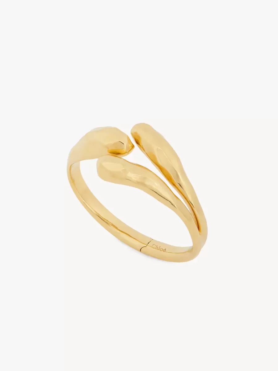 El yapımı hissi için pürüzsüz ve çekiçlenmiş dokulara sahip vintage altın pirinçten yapılmış Chloé Curl Toi et Moi bileziği. Bu parça bir Chloé logosu gravürüyle işaretlenmiştir.