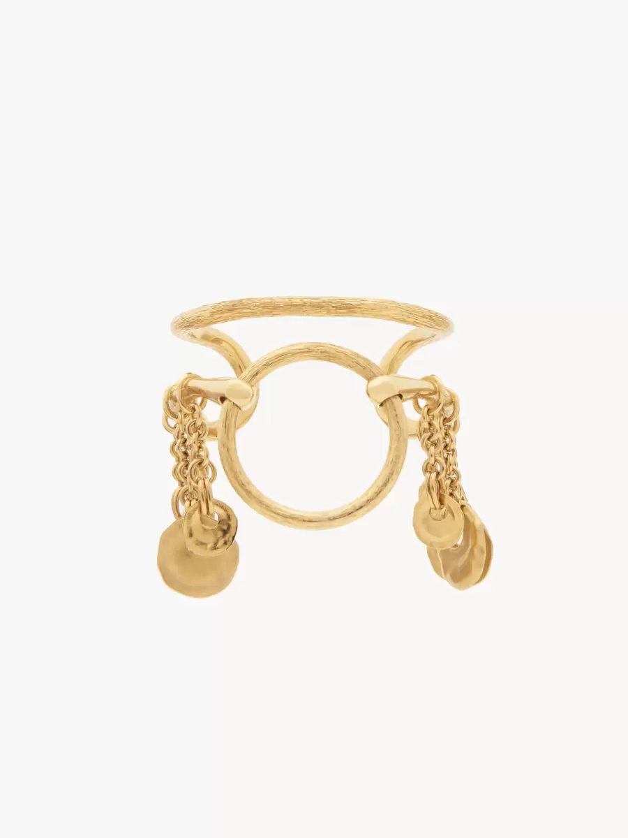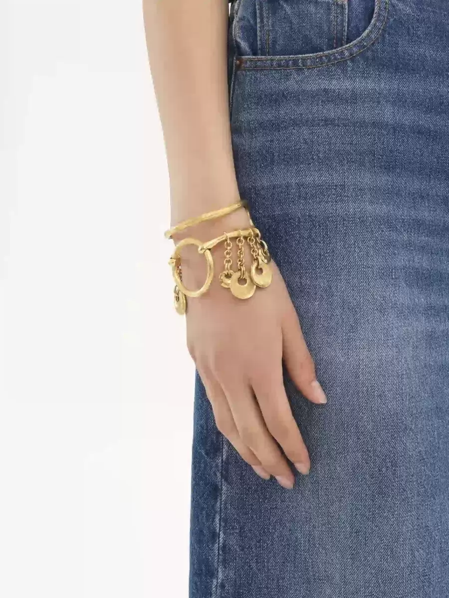Vintage altın pirinçten Chloé Eklektik bileklik. Pürüzsüz, çekiçlenmiş ve fırçalanmış dokuları, cilalı ve mat yüzeylerle bir araya getiren bileklik, grafik, kavisli çizgiler ve sallanan zincirlere yerleştirilmiş çok sayıda taç yaprağı kolye ucuyla öne çıkıyor. Bu parça, bir Chloé logosu gravürüyle işaretleniyor.