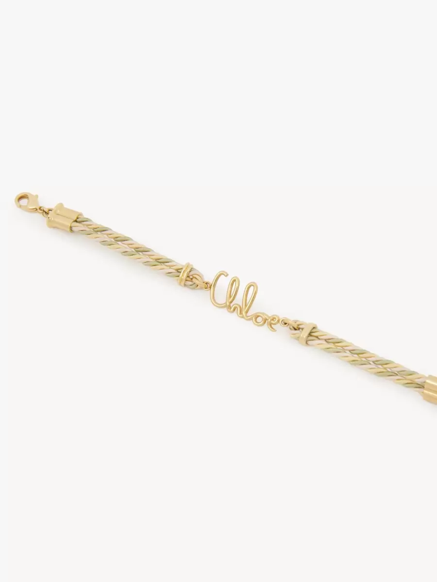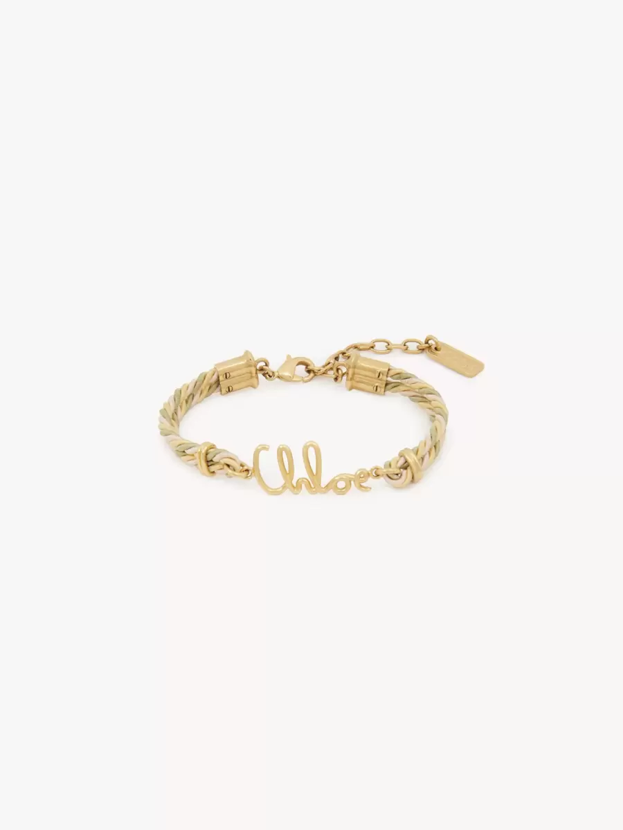 Pastel tonlarda çift pamuk-viskon örgülü, altın pirinçten Chloé Plage bileklik. Markanın mirasından ilham alan Chloé Iconic imzası, orta kısmını süslüyor. Altın tonlu bir Chloé logo plakası, bu ayarlanabilir bileziği tamamlıyor.