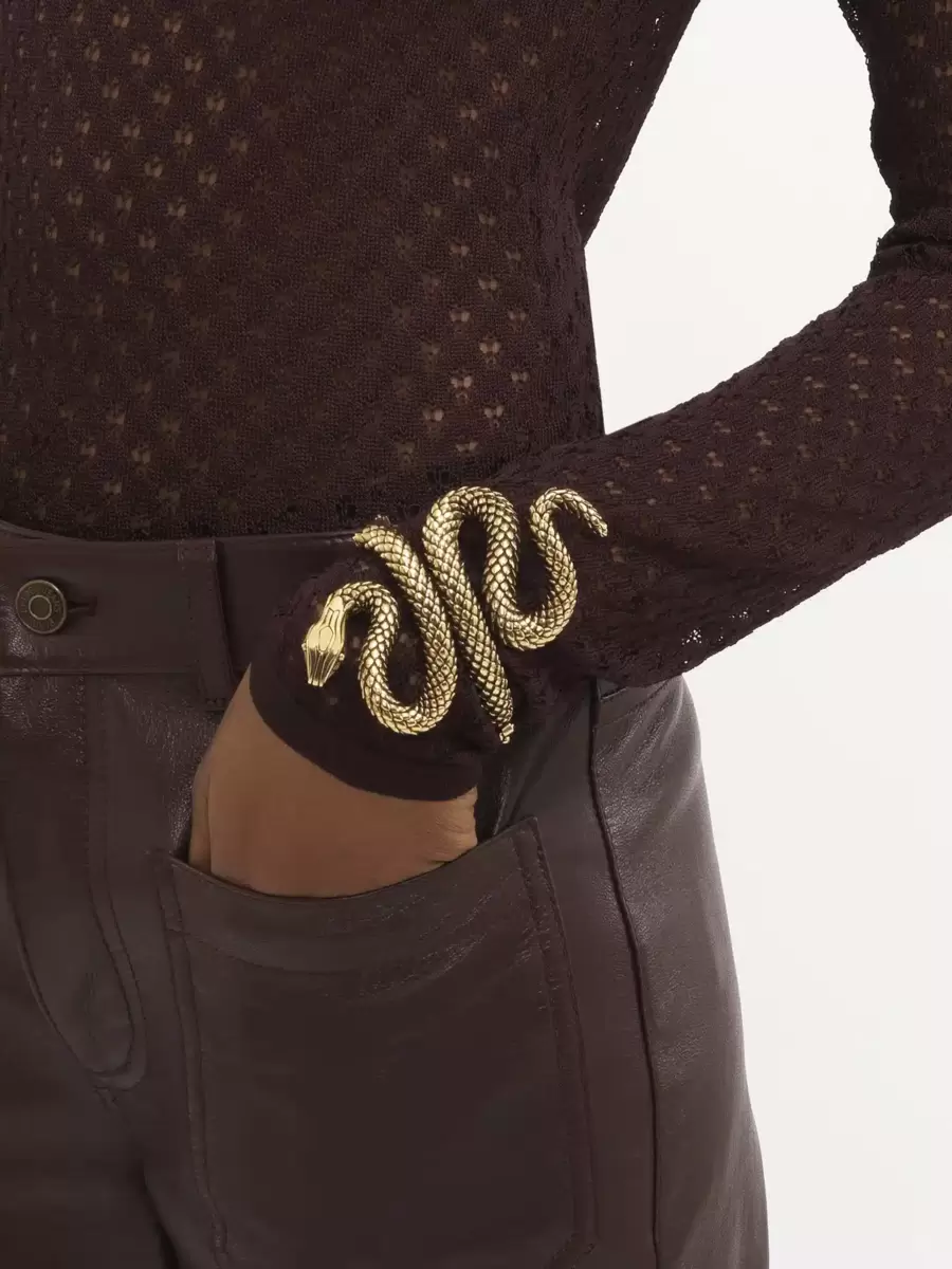 Chloé Yılan Bileklik, arşivlerden kalma bir Chloé elbise üzerindeki işlemelerden esinlenerek podyumda sergilendi. Derinlik yaratan küçük pullar, kıvrımlı şekli ve zarif yılan başı bu bileziği heykelsi ve iddialı bir parça haline getiriyor. Altın ve siyah tonlarının karışımı doku yaratıyor. Bilekliği bluz kollarınızın üzerine modern bir dokunuşla takarak podyum havasını yakalayın.