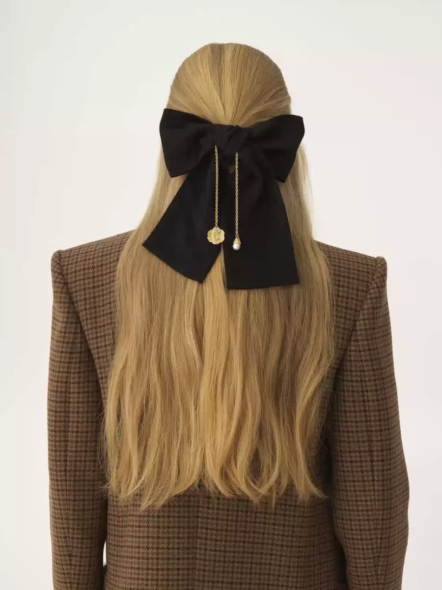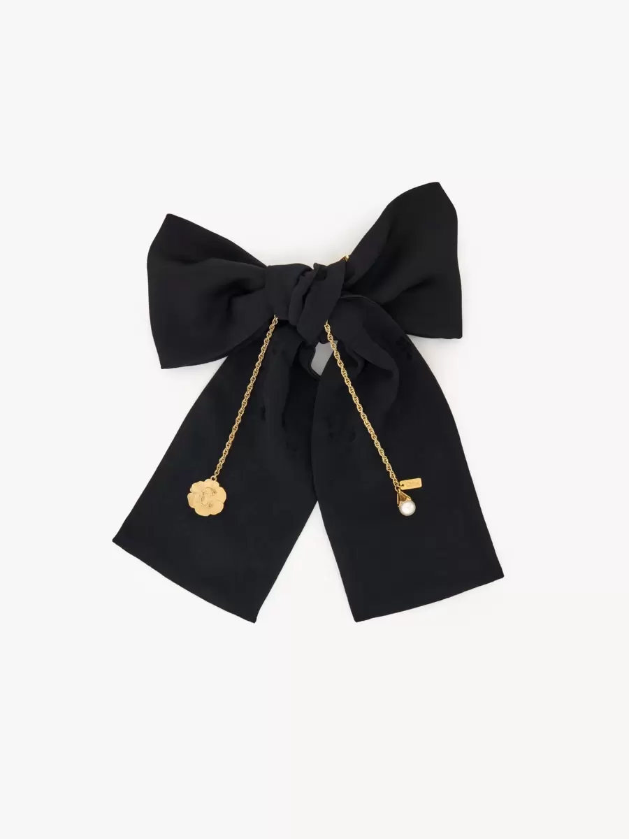 Viskon ve asetat karışımından yapılmış, büyük fiyonklu Chloé Candid saç tokası, sallanan bir zincire yerleştirilmiş altın pirinç çiçekli C madalyonu ve inci tılsımıyla öne çıkıyor. Altın tonlu bir Chloé logo plakası bu parçayı simgeliyor.