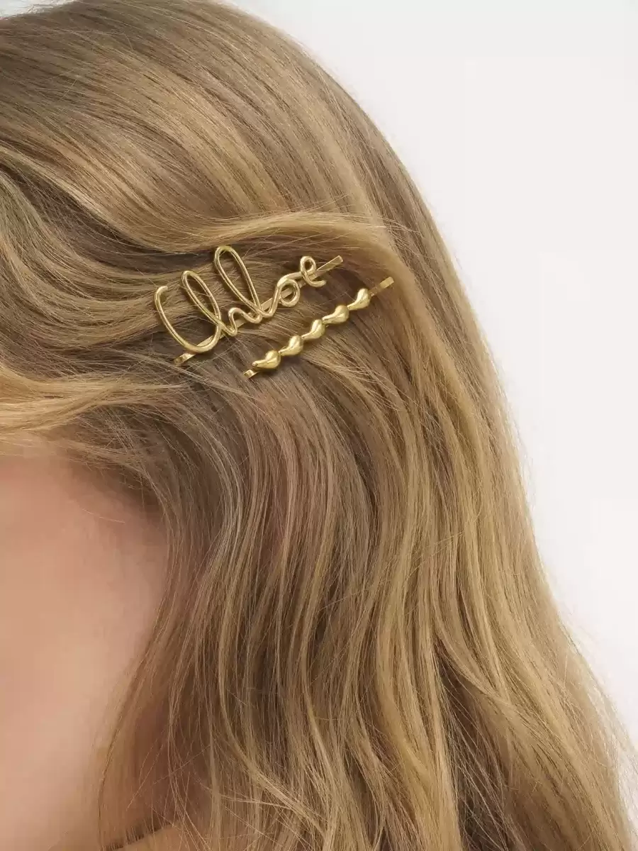 Vintage altın pirinçten yapılmış iki Chloé Iconic saç tokası seti. Bir tokada, Chloé’nin miras zincir kemerden esinlenen imzası bulunurken, diğer tokada Chloé’nin “é”sine gönderme yapan bir dizi vurgu yer alıyor. Bu saç tokaları, Maison’un mücevher koleksiyonundaki diğer parçalarla birlikte kullanılabilir.
