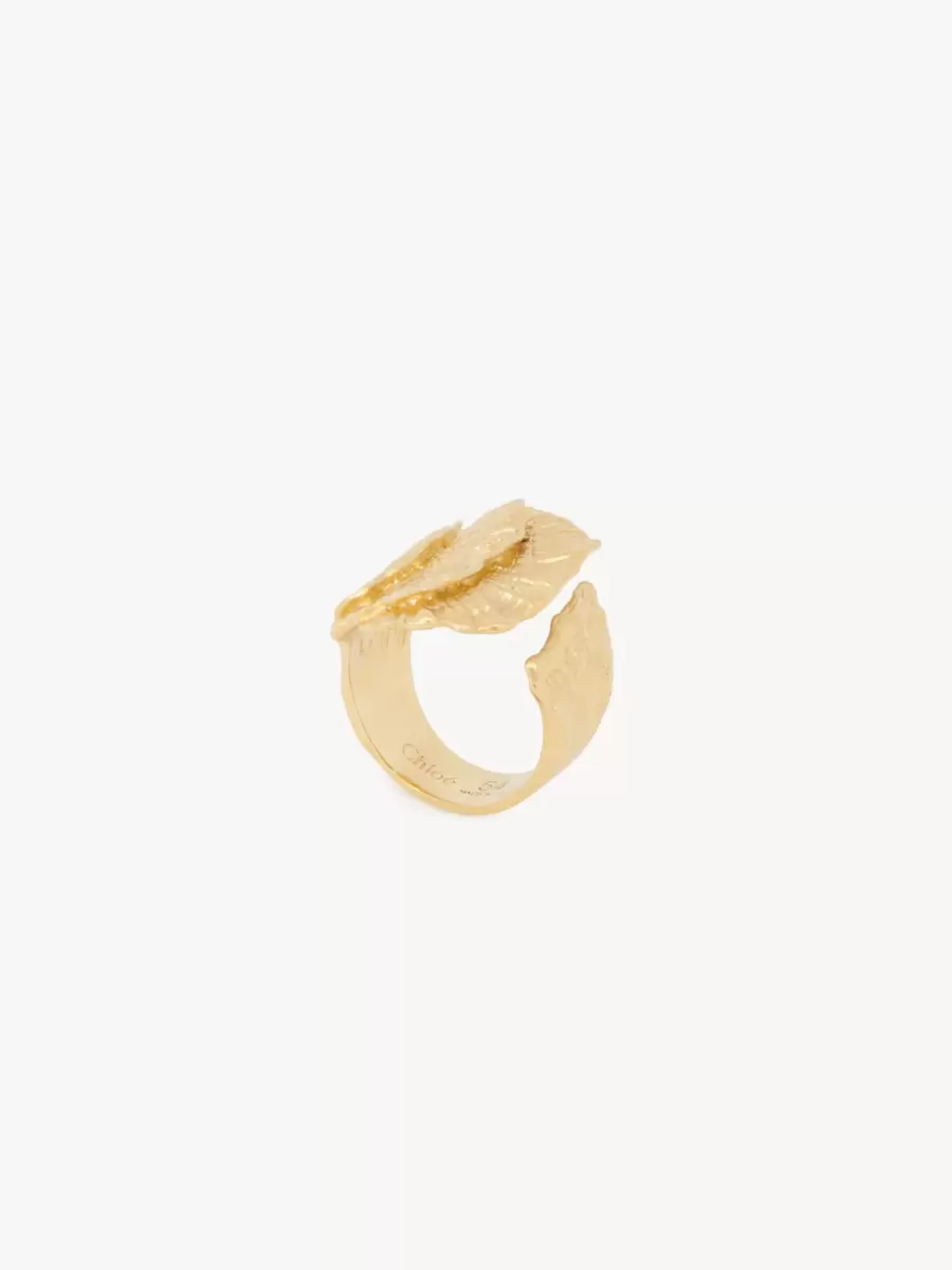 Büyük bir ginkgo yaprağını tasvir eden dokulu, vintage altın pirinçten yapılmış Chloé Shells yüzük. Bu yüzüğün üzerinde bir Chloé logosu gravürü bulunmaktadır.