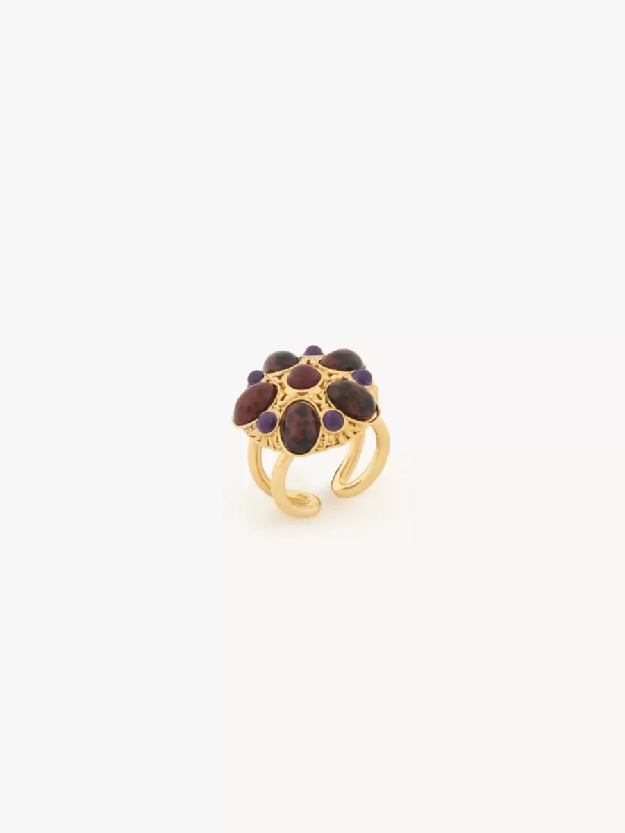 Renkli reçine ve kahverengi obsidyen çivilerle süslenmiş büyük, dekoratif bir çiçeği tasvir eden altın pirinçten yapılmış Chloé Sonsuzluk yüzüğü. Çift bant arkada açık. Bu parça bir Chloé logosu gravürüyle işaretlenmiştir.