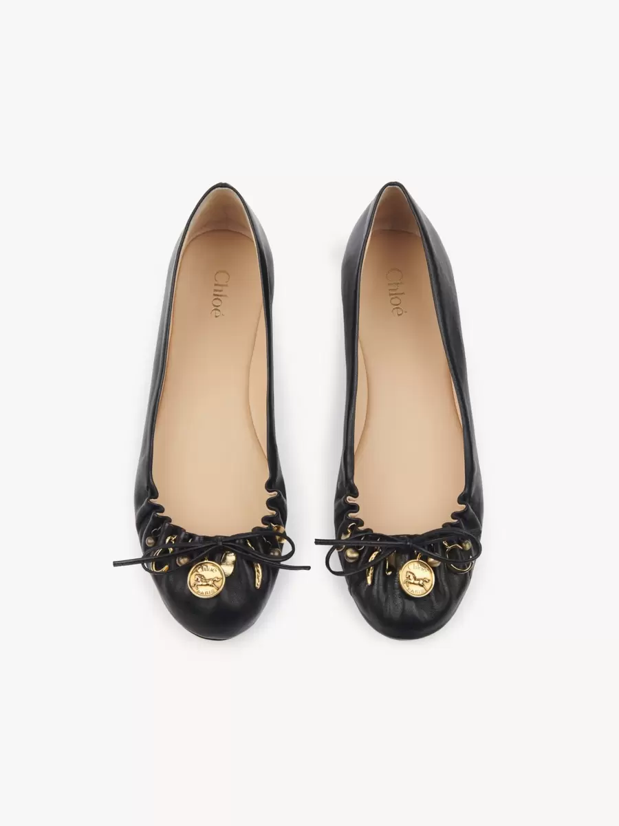 Nappa kuzu derisinden üretilen Chloé Charms babetler, badem burun şeklini pileli ön kısım, tonlu fiyonk süslemesi ve Maison’un mirasından ilham alan altın tonlu takılarla birleştiriyor.