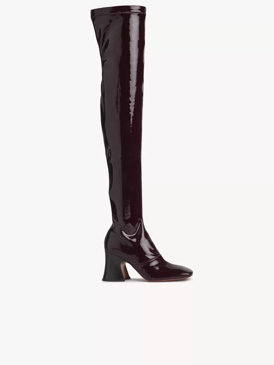 Bu Janis diz üstü botlar, patentli streç kumaştan üretilmiştir. Kontrast oluşturan, yığılmış, genişletilmiş topuk üzerine oturtulmuş botlar, yüksek boru paçalı ve zarif kare burunlu bir yapıdadır.