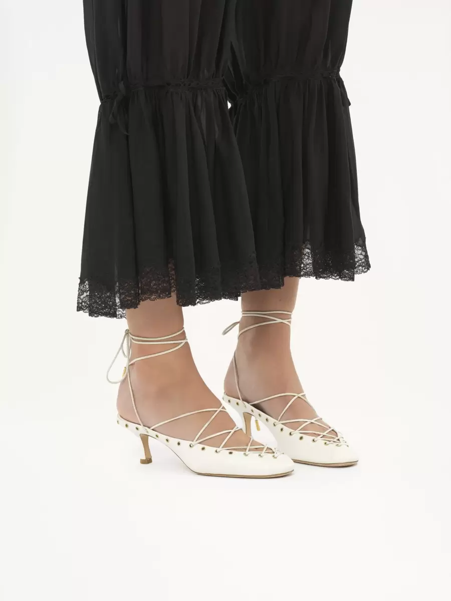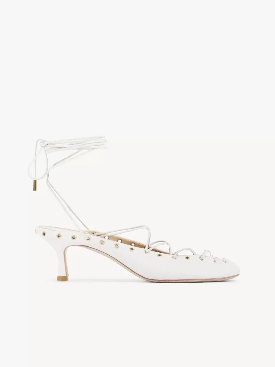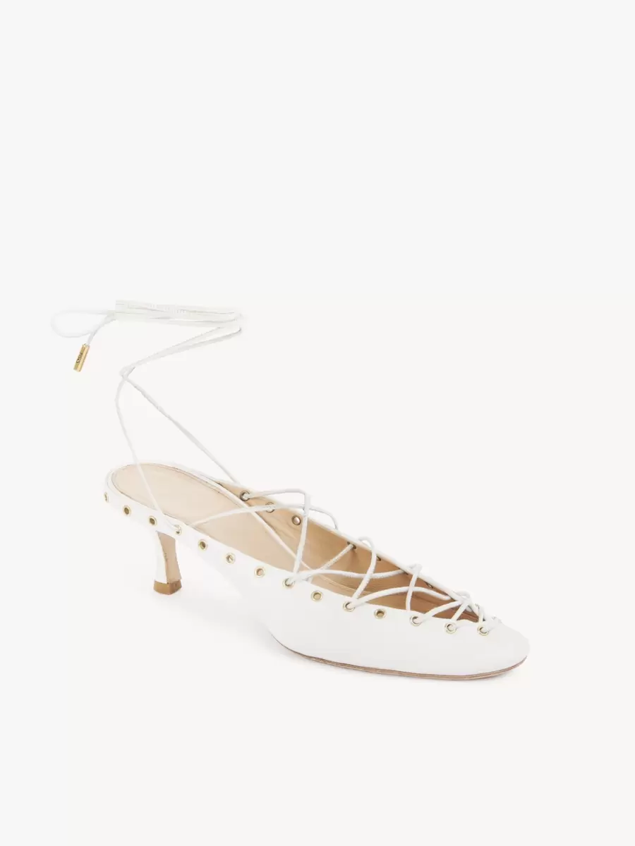 Bu Chloé Ghillies ayakkabılar nappa kuzu derisinden üretilmiştir. Kavisli bir yavru kedi topuğa sahip olan ayakkabılar, badem burun şeklini açık sırt siluetiyle birleştirir. Korse esintili bağcıklar ve altın tonlu aksesuarlar, bu hafif deri ayakkabılara şıklık katar.