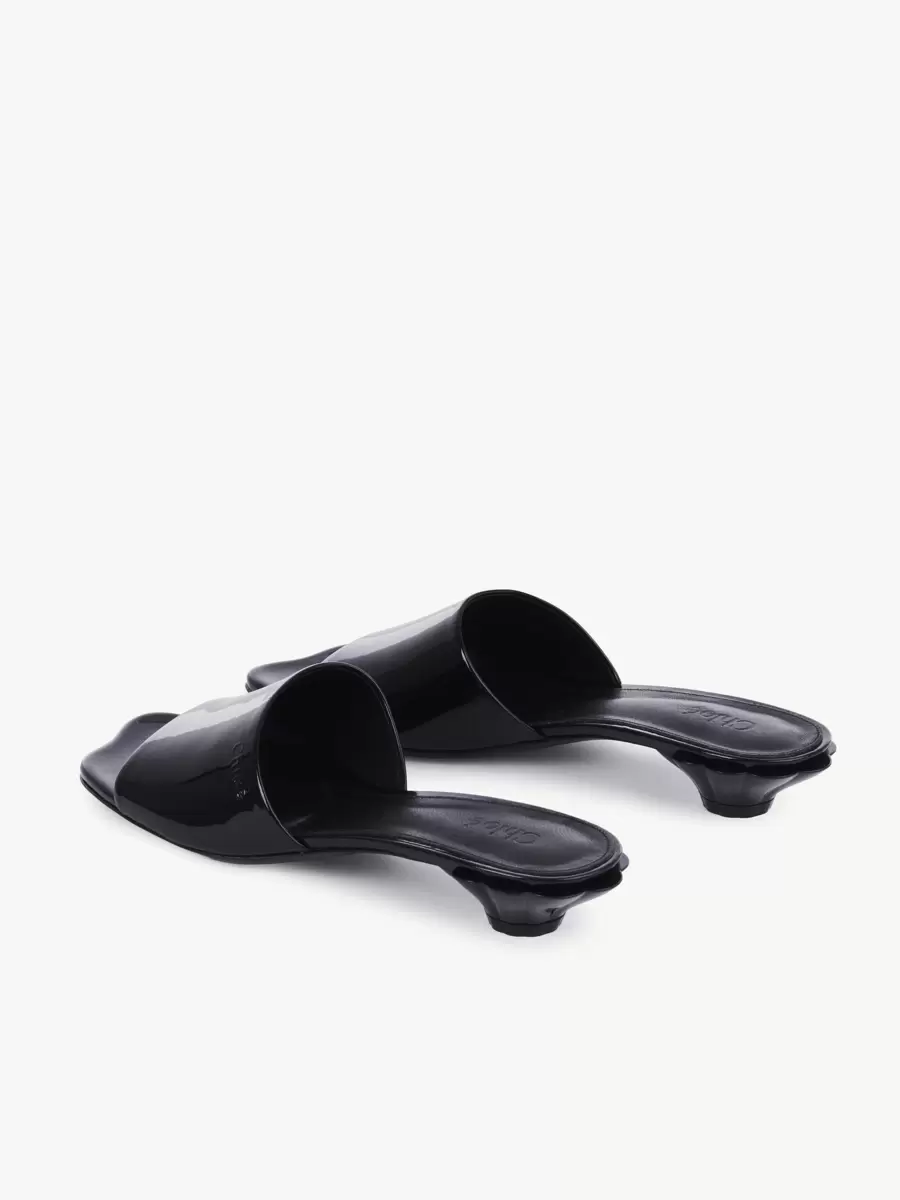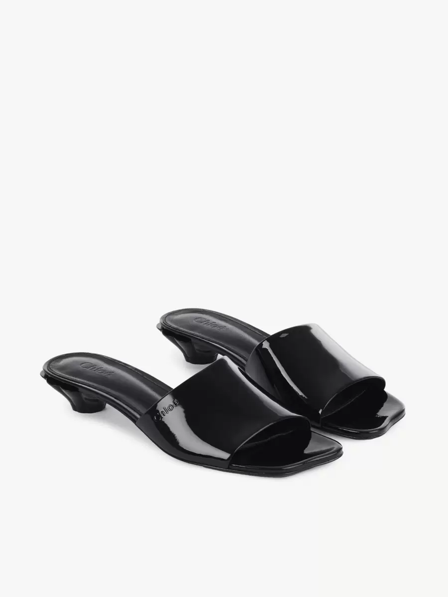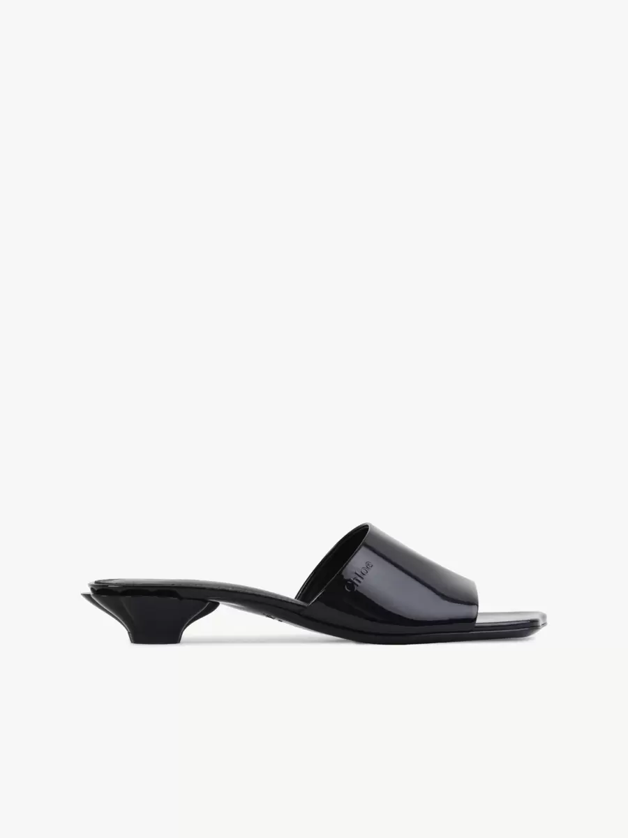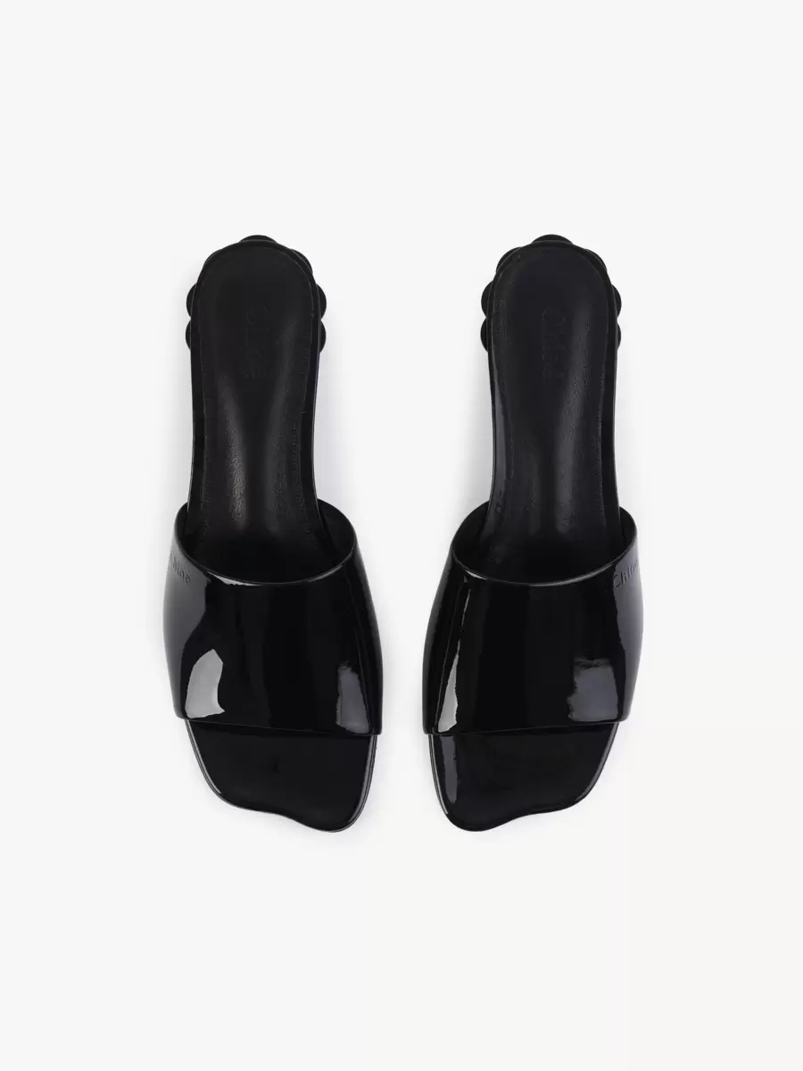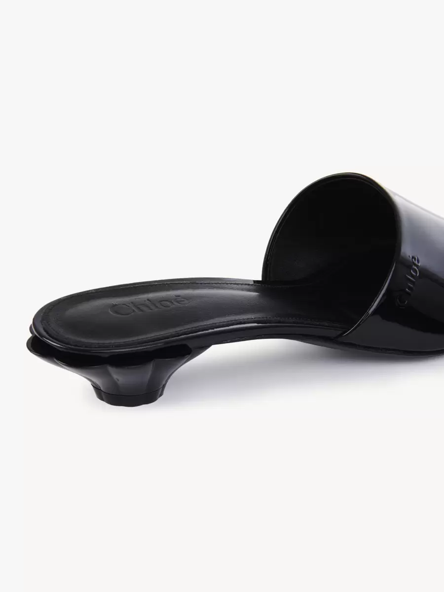 Vernikli dana derisinden üretilen Flower terlikler, belirgin dalgalı bir tabana ve deniz kabuğu şeklindeki bir topuğa sahiptir. Üst kısımda kabartmalı bir Chloé logosu bulunur.