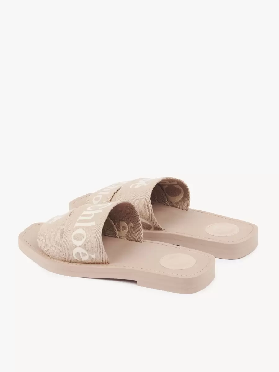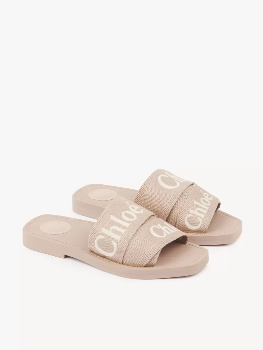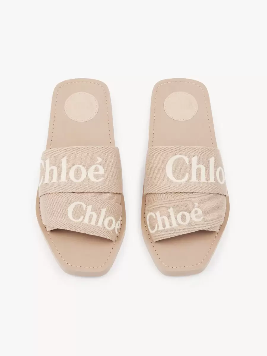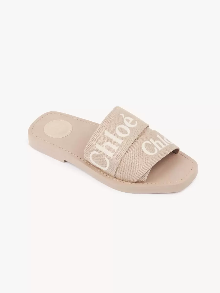 Bu Woody terlikler, düşük etkili keten kumaştan farklı boyutlardaki şeritlerden üretilmiştir ve kontrast Chloé logosu işlemeleriyle tamamlanmıştır.