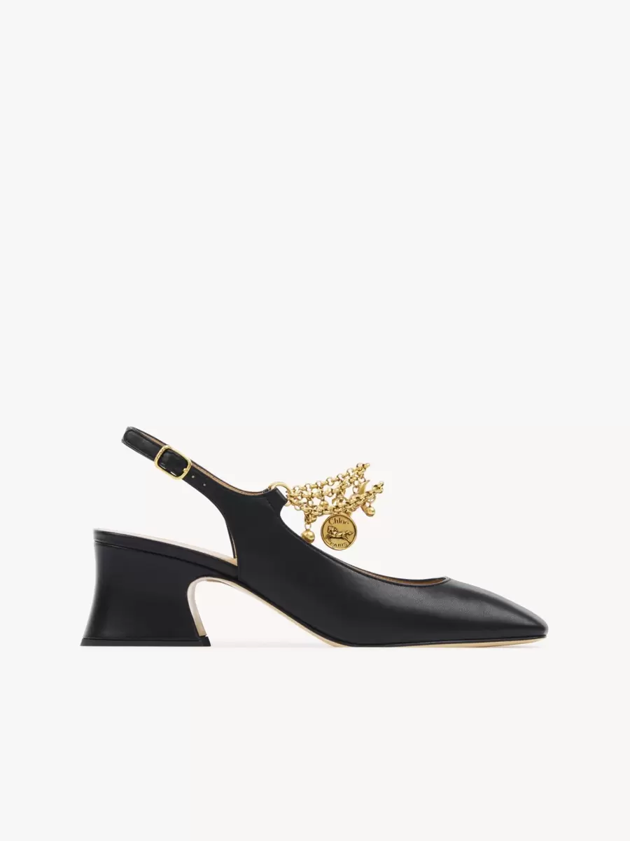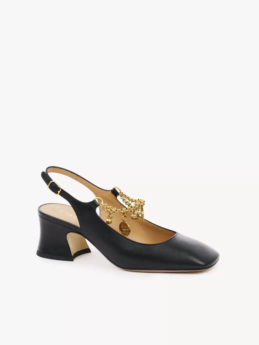 Nappa kuzu derisinden üretilen Chloé Charms slingback topuklu ayakkabılar, geniş blok topuk ve ayarlanabilir tokalı bilek kayışını bir araya getiriyor. Altın tonlu zincir, Maison’un mirasından ilham alan Chloé Charms ile ayağı süslüyor.