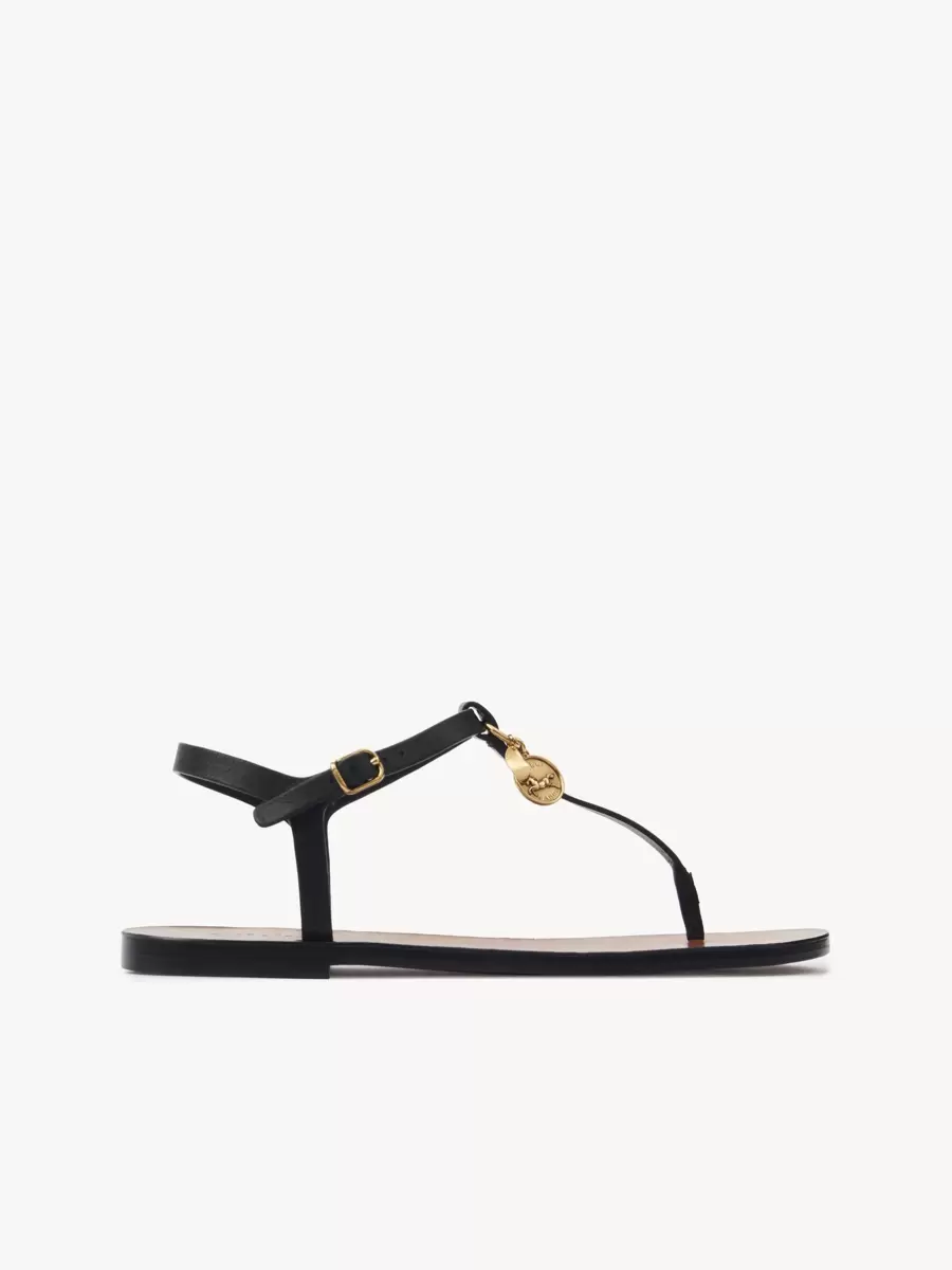 Parlak dana derisinden üretilen Chloé Charms düz sandaletler, zarif bir parmak arası sayayı ayarlanabilir tokalı bilek kayışıyla birleştiriyor. Ön kısım, Maison’un mirasından ilham alan zarif altın tonlu tılsımlarla süslenmiştir.