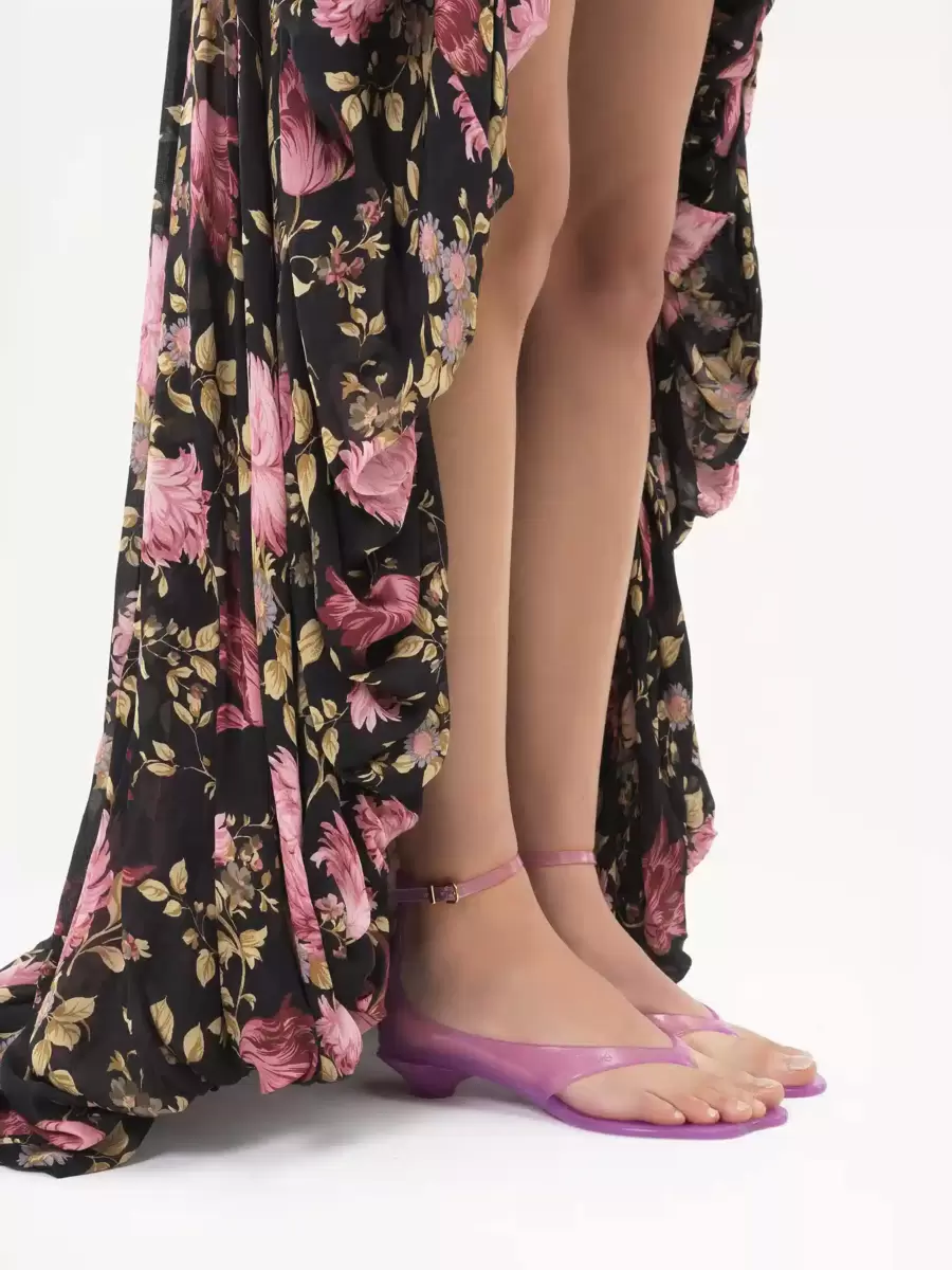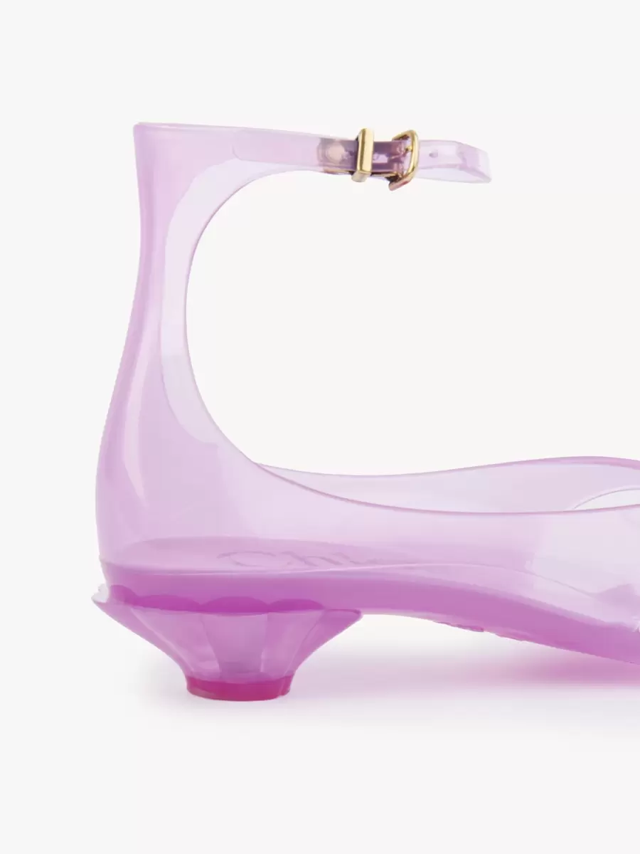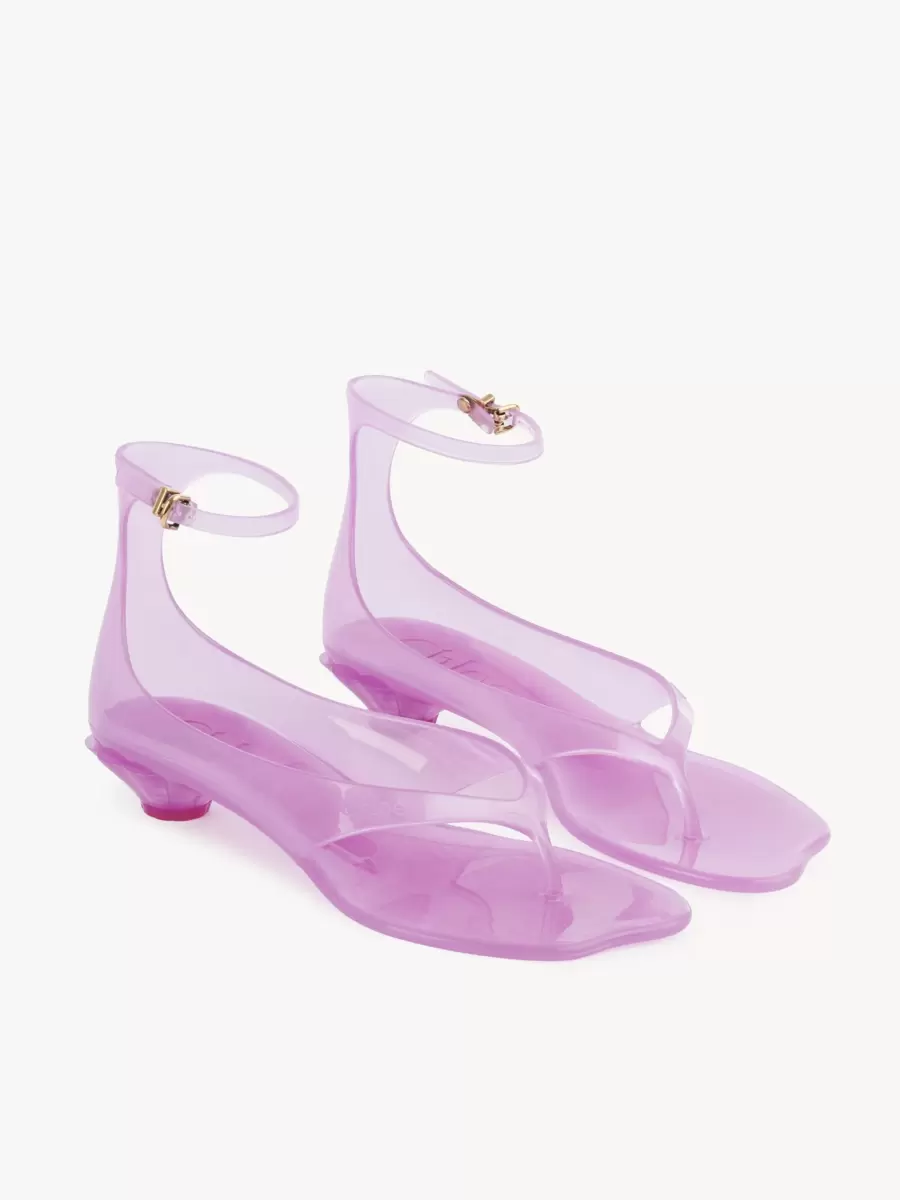 Şeffaf TPU’dan üretilen Chloé Jelly sandaletler, parmak arası ön kısmı, belirgin dalgalı tabanı ve deniz kabuğu şeklindeki topuğu bir araya getiriyor.