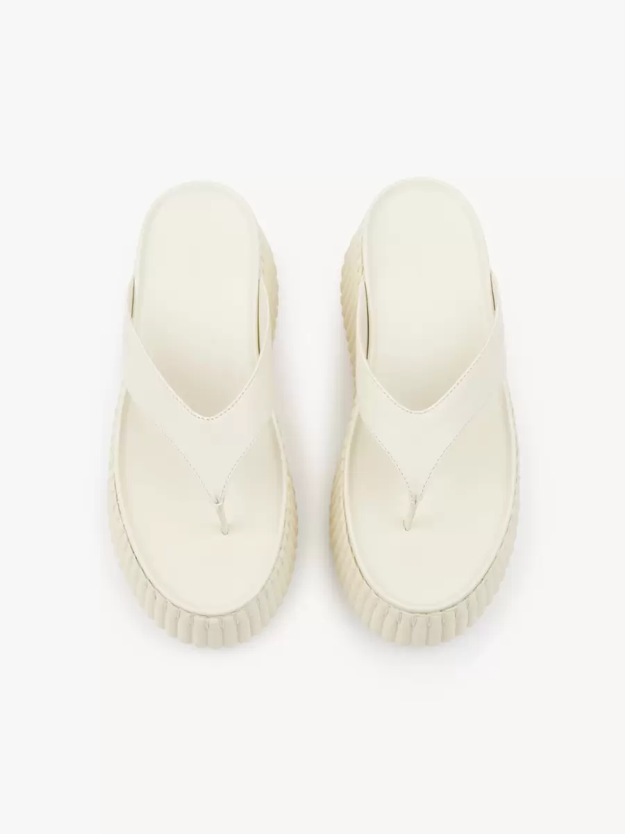 Dana derisinden üretilen bu Nama kama topuklu terlikler, Chloé logosuyla işlenmiş ön kısımda parmak arası terliklere sahiptir. 4,5 saatte elle tamamlanan kusursuz tonlu battaniye dikişleriyle tamamlanan ikonik, hafif ve ultra konforlu geri dönüştürülmüş bir platform üzerine yerleştirilmiştir.