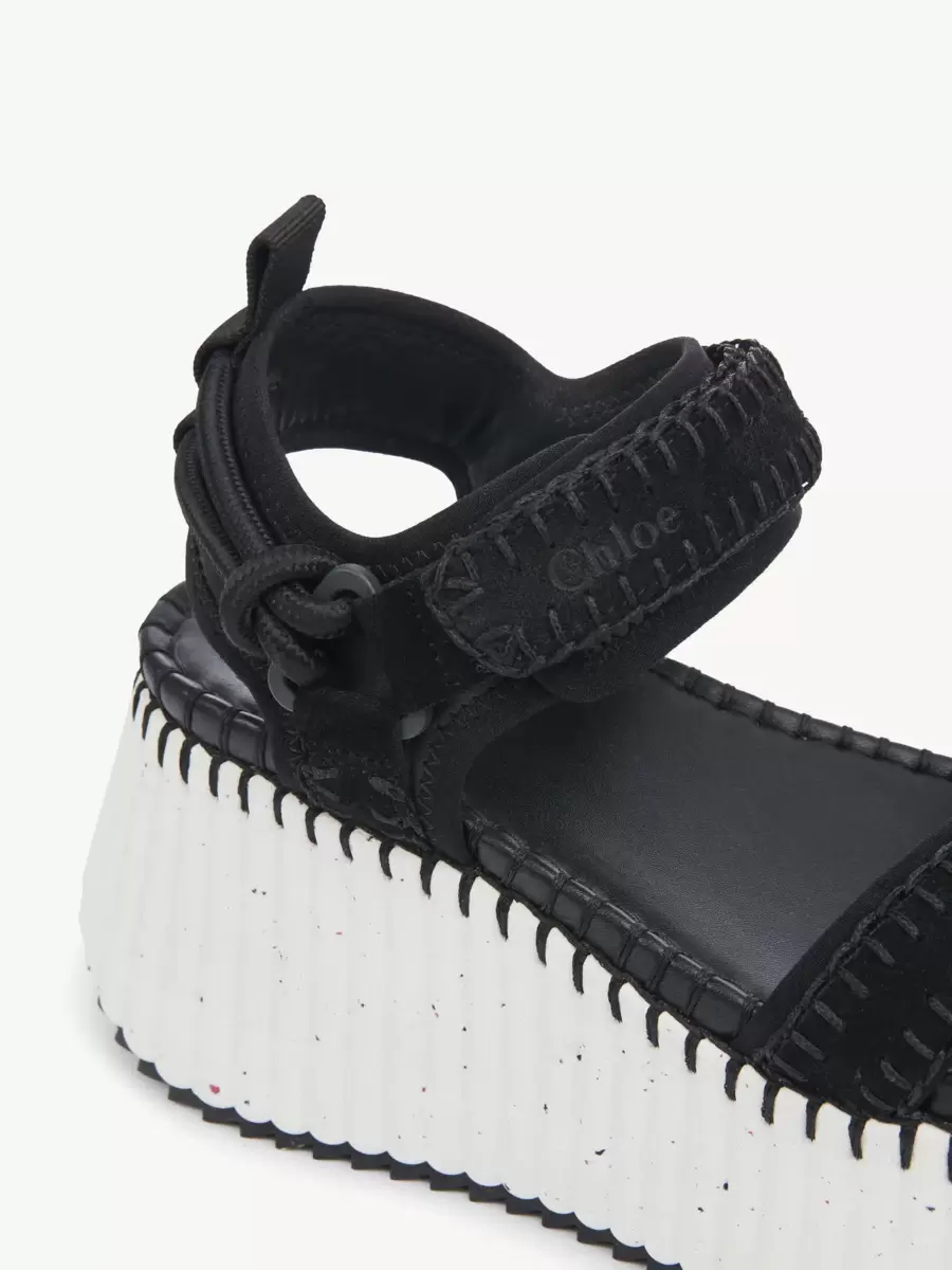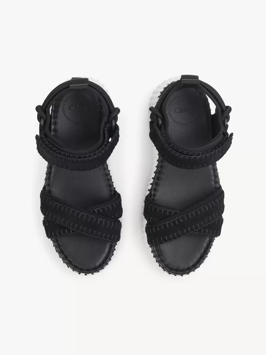 Cesur ve hafif olan ultra konforlu geri dönüştürülmüş platform tabanı, serinin kendine özgü el dikişiyle tamamlanan çıkıntılı bir dokuya sahip. Süet dana derisi saya, ayarlanabilir bilek kayışı ve sportif arka halkalı çapraz ön kayışlarla ve denizci düğümleriyle bağlanmış tonlu bağcıklarla birleşiyor.